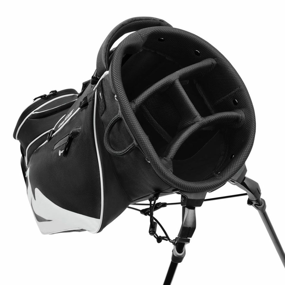 9型サイズでクラブの出し入れがしやすく、4分割構造によりシャフト同士の干渉を防止。スタンドの安定性にも優れ、芝上でもしっかり自立します。デザイン性と機能性を両立した一品です。