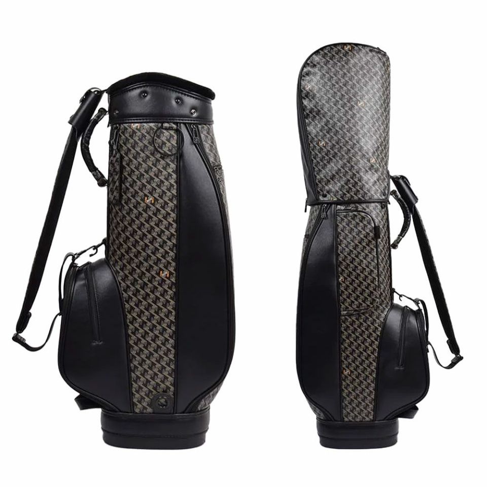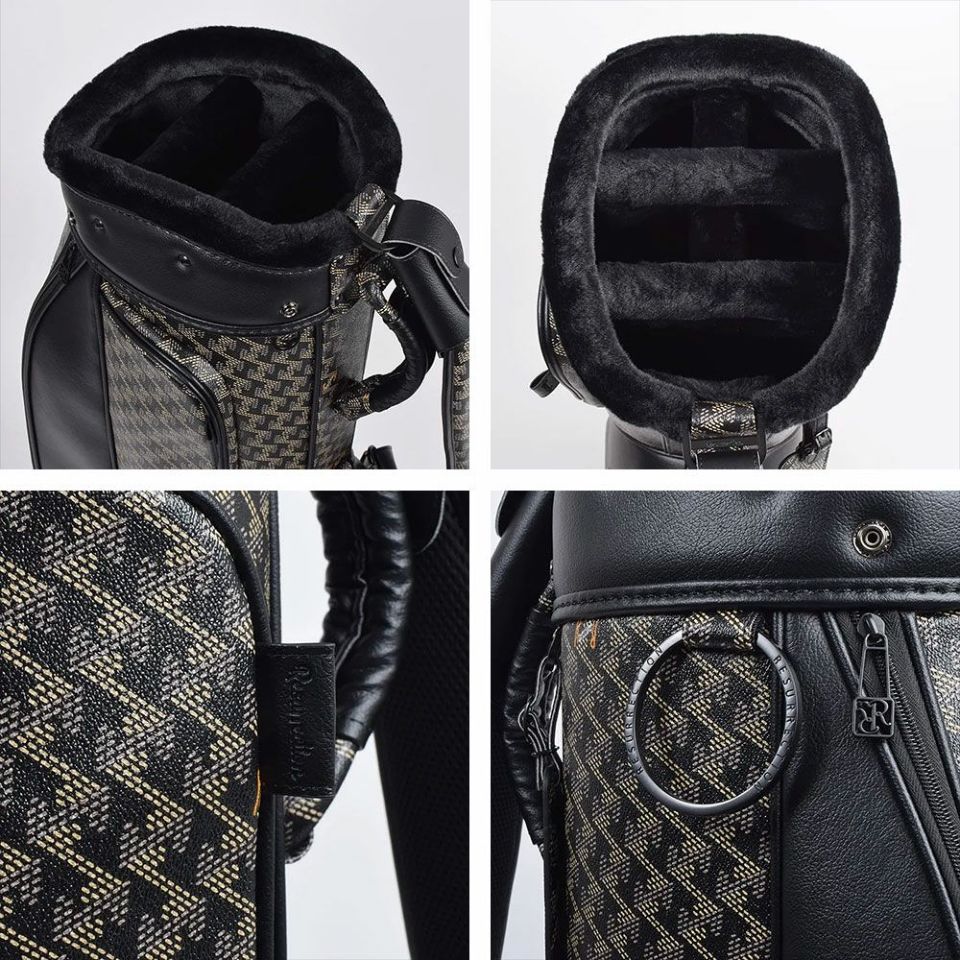 中心にはブランドロゴをあしらい全体的に角を出したデザインの金属パーツが加わることで、キャディバッグの雰囲気がグッと引き締まり、一気に高級感がアップ致しました。