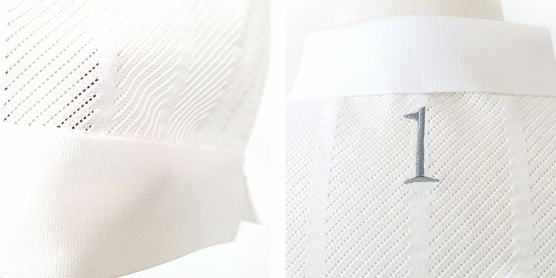 前見頃は糸本数を多くして透けない設計をしており、後ろ身頃は通気性をよくしています。