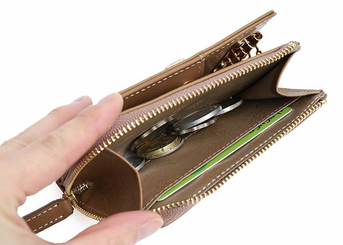 ファスナーポケットを備えたスナップボタン開閉のキーケースです。 ファスナーポケットはL字型で開きやすく、スマートキーなどが収納できます。また、カードポケット×1を内蔵しているのでICカードや小銭を収納して小銭入れ、ミニ財布としてもご利用いただけます。