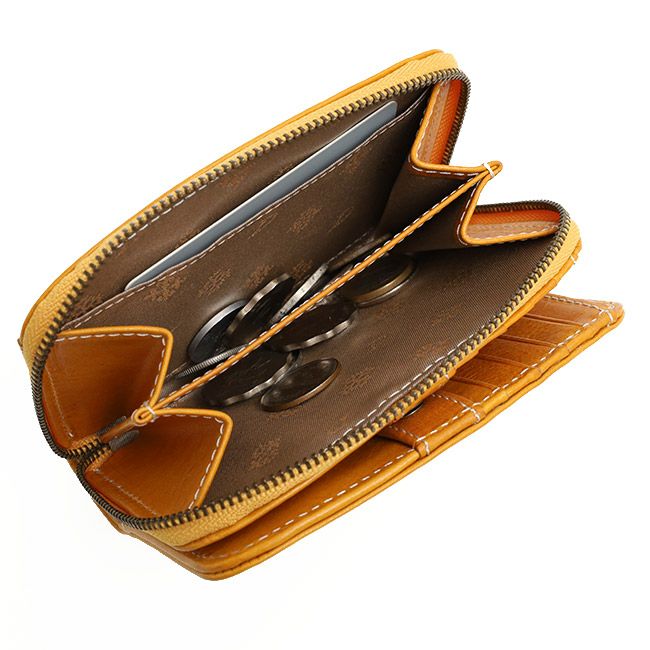緩やかなラウンドフォルムが優しい印象の二つ折り財布。ラウンドファスナー式の小銭入れにダイレクトにアクセスできるので、小銭の出し入れがスムーズに行えます。