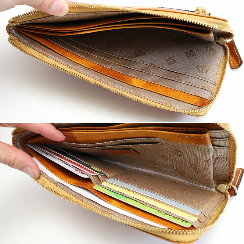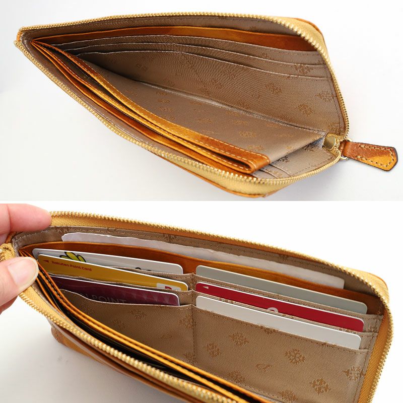 内側のファスナーレスな小銭入れは視認性が高く、14枚収納可能なカードポケットでマチのないスリムなデザインながら収納力に優れて機能的です。