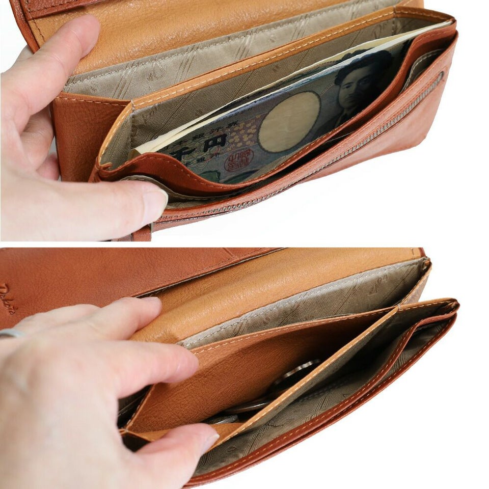 収納スペースが3つに分かれており、背面と中央部分がお札入れ、正面側はフリーポケットになっています。