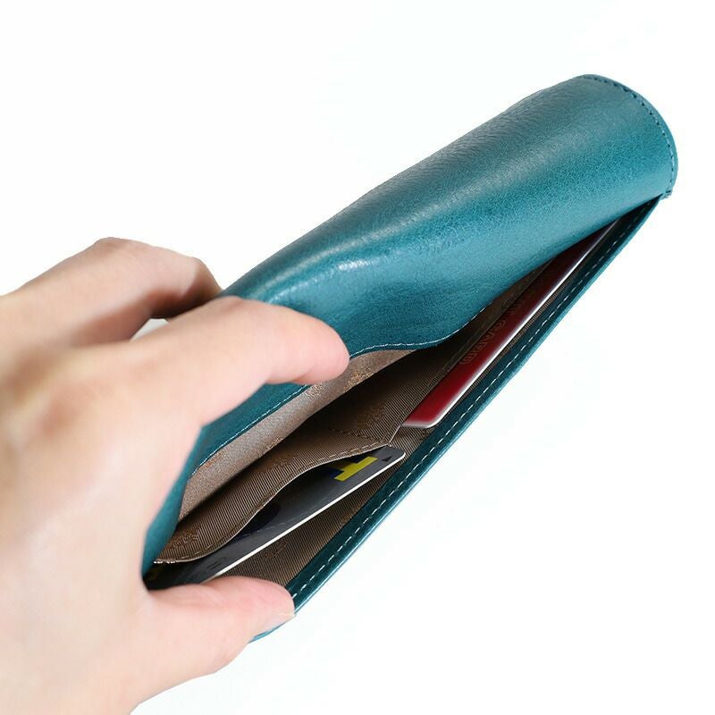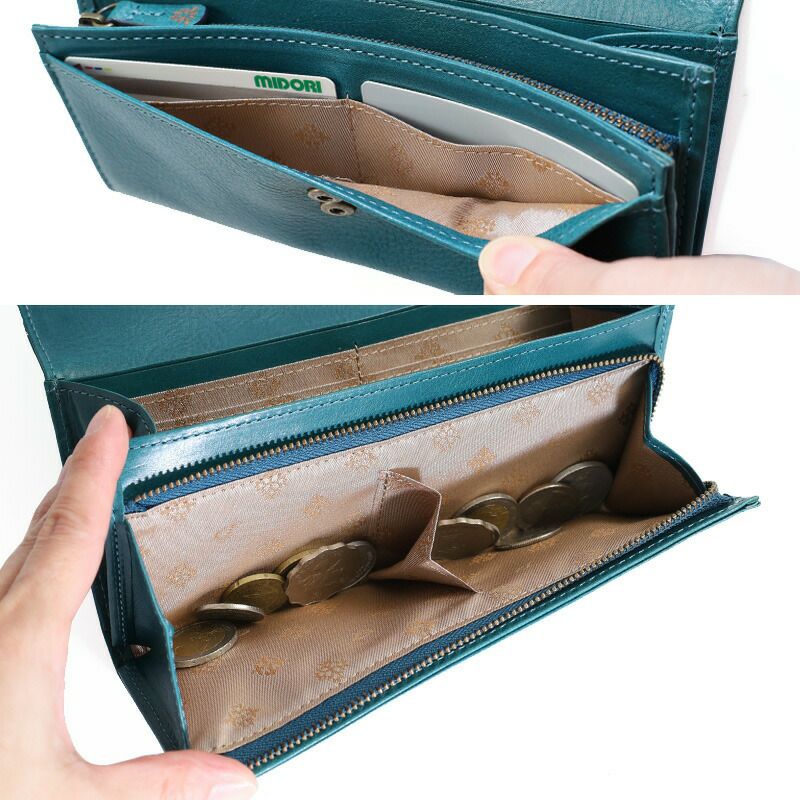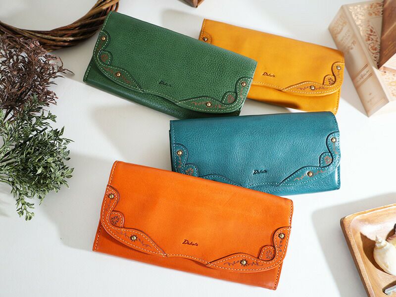 かぶせフラップの曲線や縁取りが印象的な長財布です。