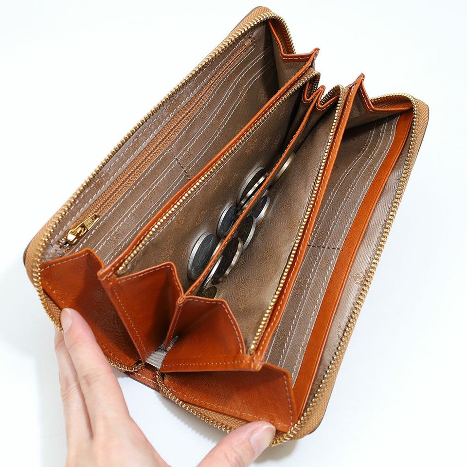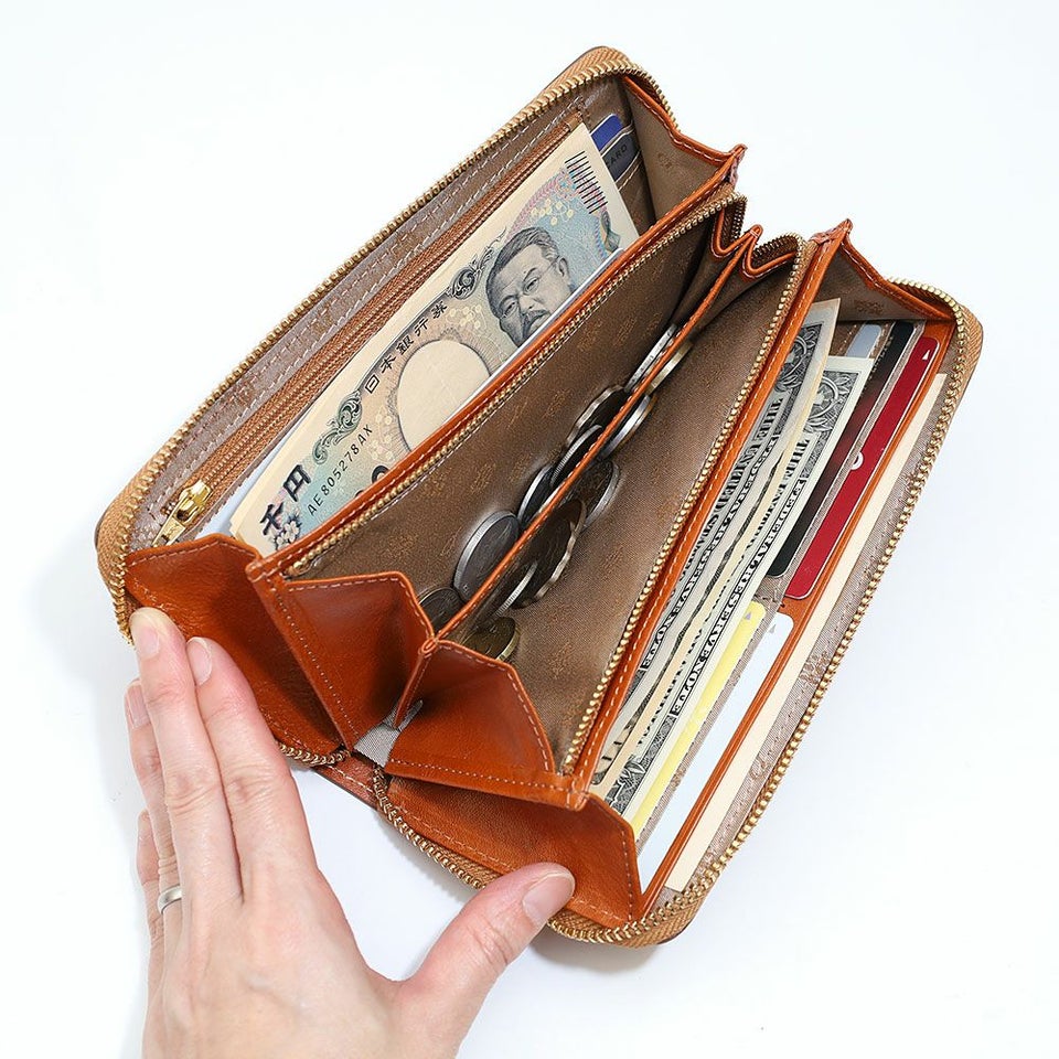 紙幣やカード、小銭をまとめて収納できる長財布タイプです。中身を見渡しやすく、会計時もスムーズに扱えます。日常使いに十分な収納力を備えた実用的な設計です。