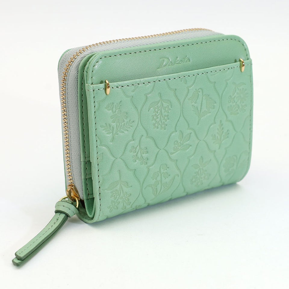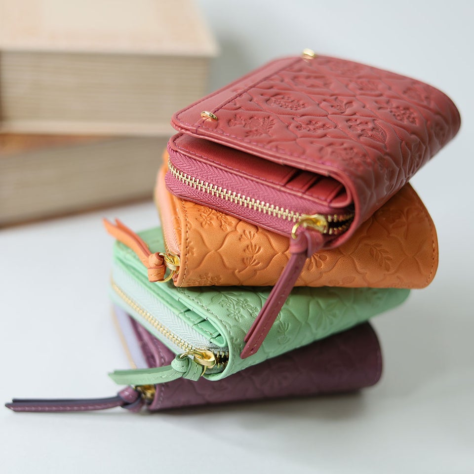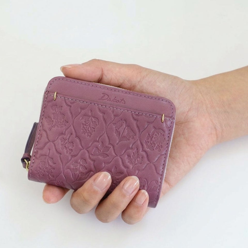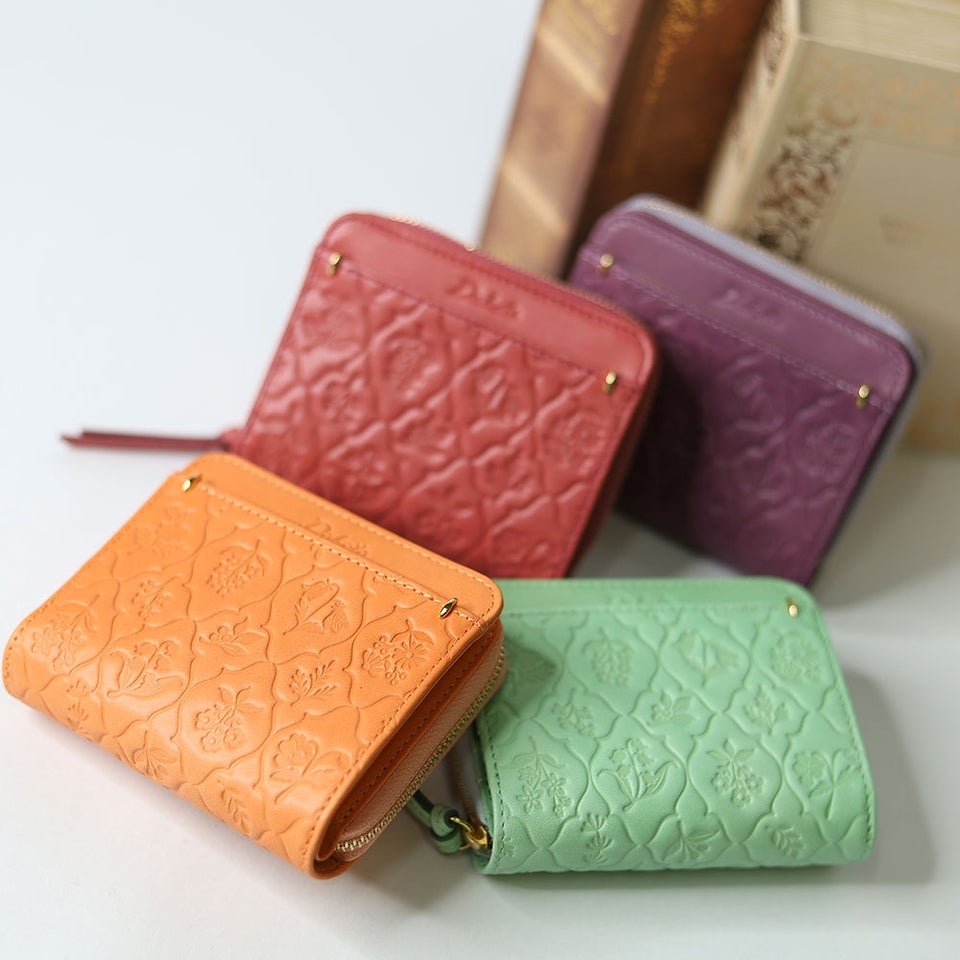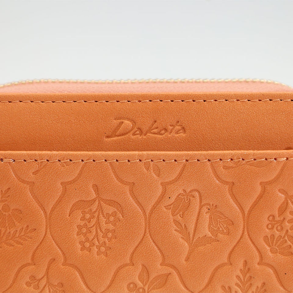 古い植物図鑑に描かれた草花をモチーフにしたオリジナルのエンボス柄を施しています。ナチュラルで愛らしいデザインが革にやさしい表情を与え、上品で落ち着いた雰囲気を演出。ダコタならではの温かみのあるデザインが、大人の女性の手元をさりげなく彩ります。