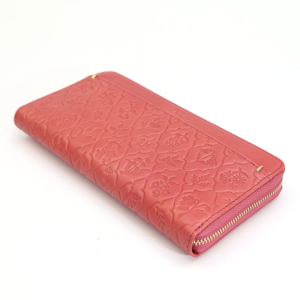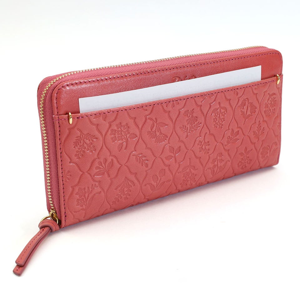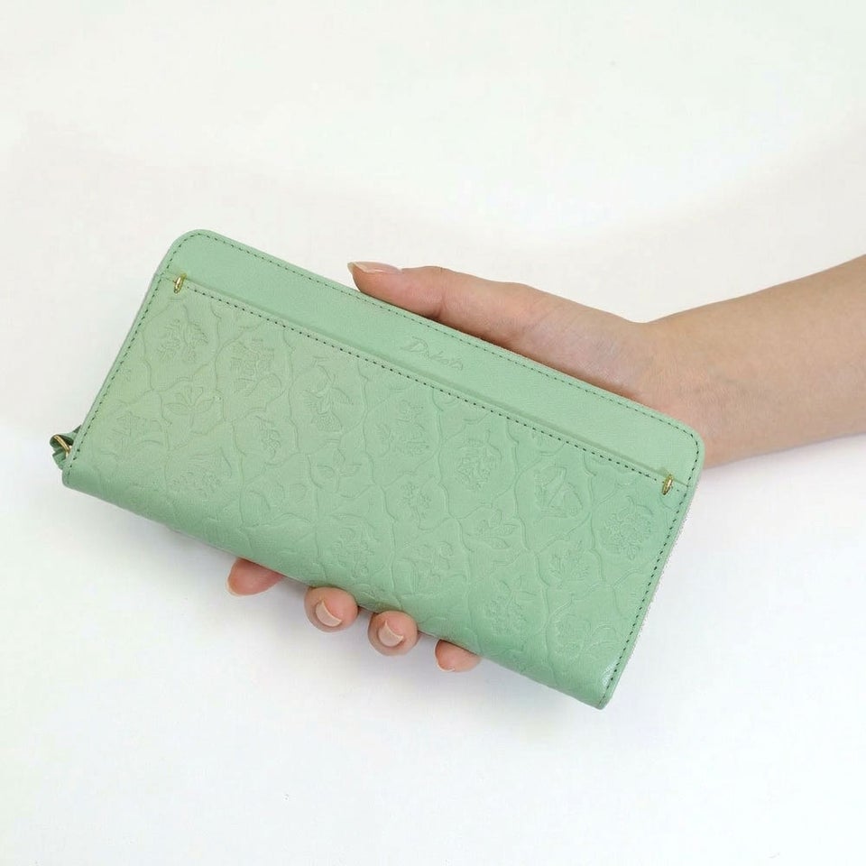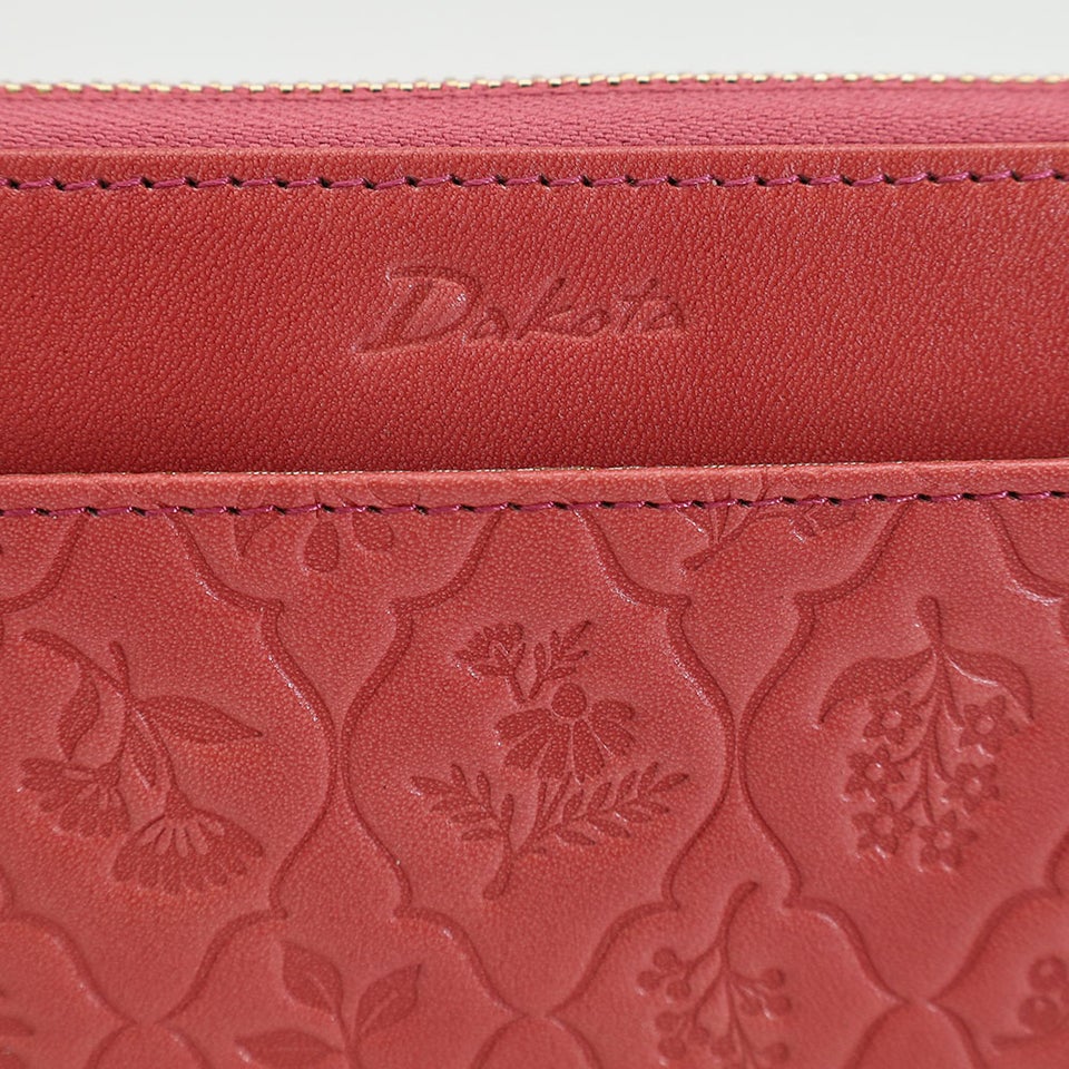 古い植物図鑑に描かれた草花をモチーフにしたオリジナルのエンボス柄を施しています。素朴で愛らしい花のモチーフがさりげなく広がり、可愛らしさと上品さを兼ね備えたデザインに仕上げられています。毎日使う財布にやさしい華やかさを添えてくれる、Dakotaならではのデザインです。