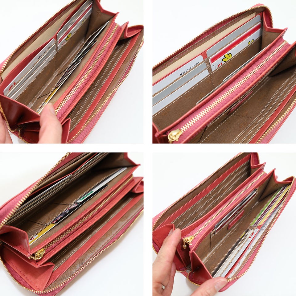 カードポケットは17枚分あり、ポイントカードやクレジットカード、会員証などをしっかり整理して収納できます。さらにお札やレシートも分けて入れやすい設計で、財布の中を整った状態で使うことが可能です。収納力と整理のしやすさを兼ね備えた、毎日頼れる長財布です。