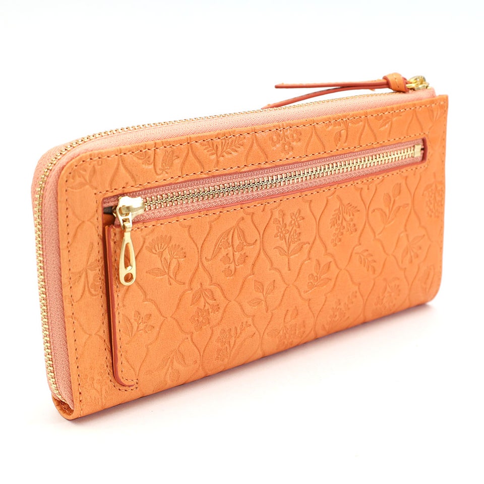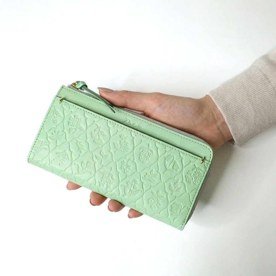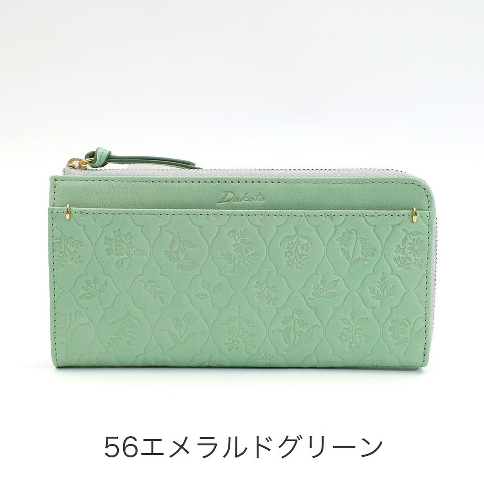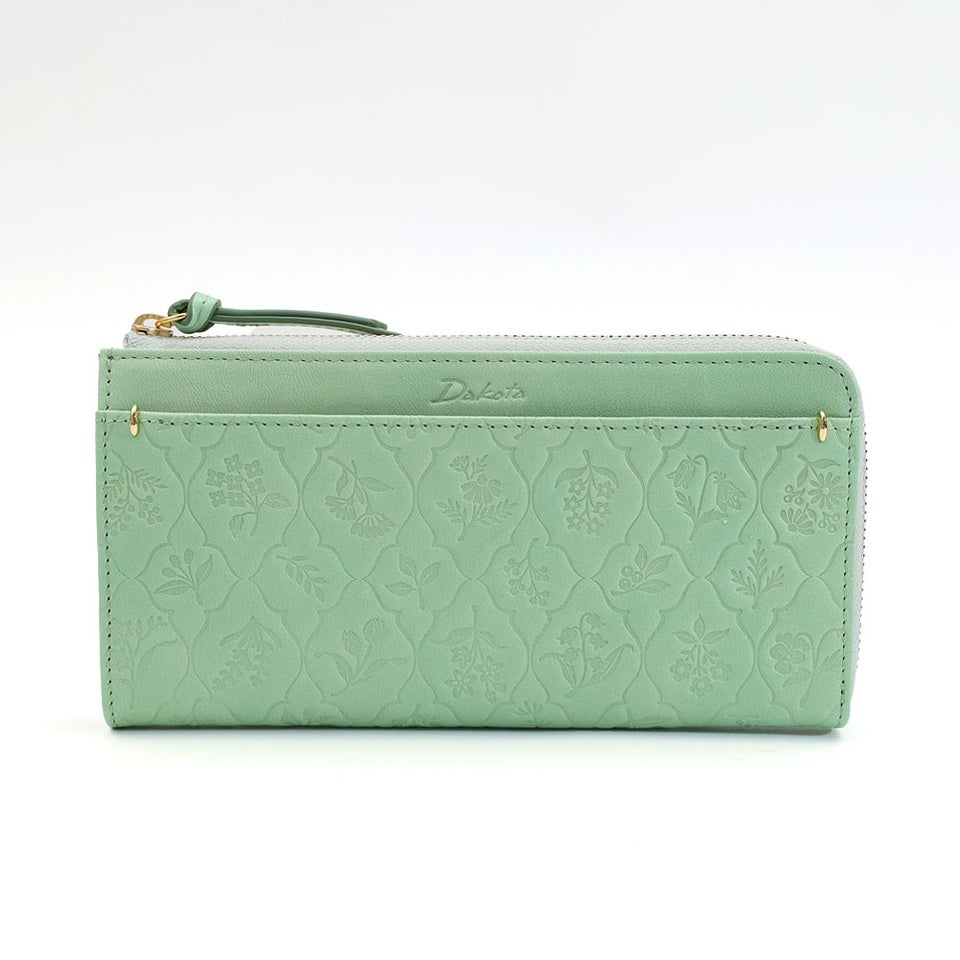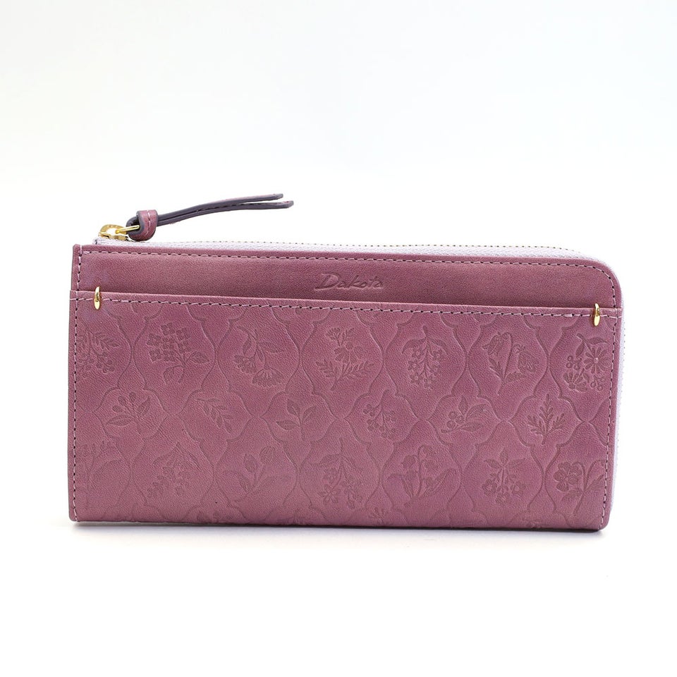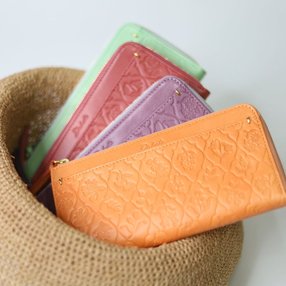 古い植物図鑑をイメージした草花モチーフのエンボス柄を施し ナチュラルで優しい印象に仕上げています。素朴で愛らしい花柄がさりげなく浮かび上がり 上品で落ち着いた雰囲気を演出します。毎日使う財布にやさしい華やかさを添える Dakotaらしいデザインです。