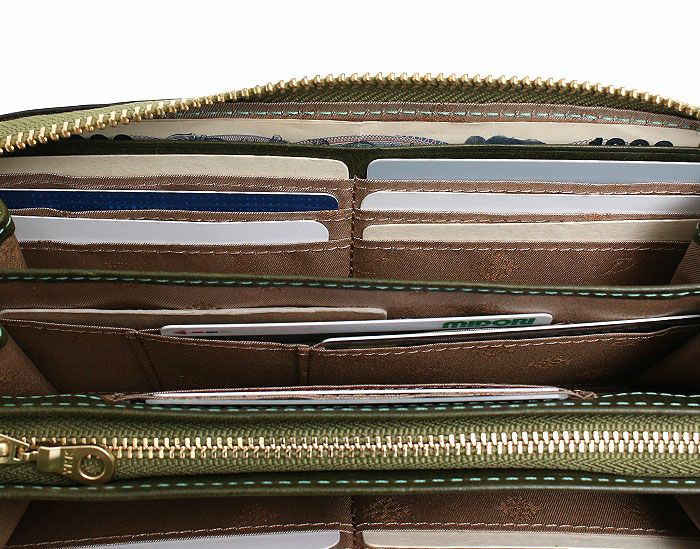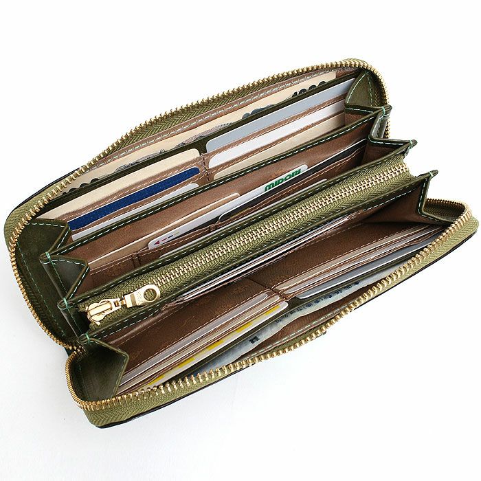 カードポケットが22か所と充実しており、カードが多い方にぴったりの財布です。お札入れは2ヵ所あり、レシートや領収書など分けて入れておくことが出来ます。小銭入れはL字ファスナー式で中に仕切りがあり、大きく開いて小銭が取り出しやすい仕様になっております。
