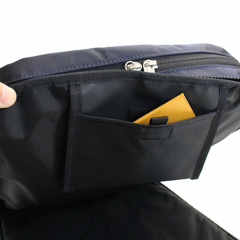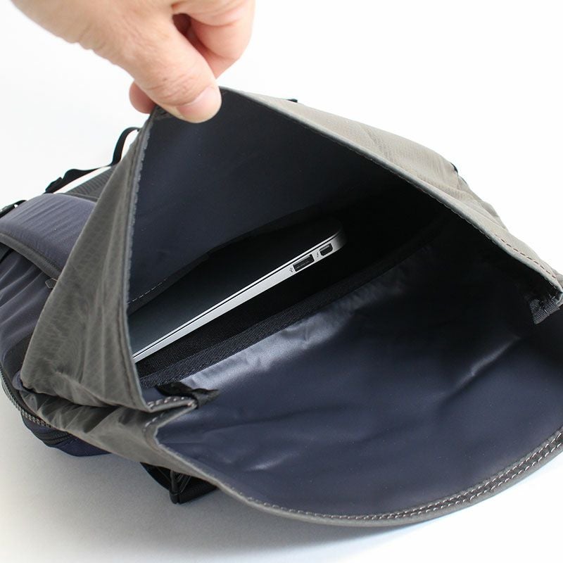 本体生地に600dのポリエステルをベースに溶剤を95%以上排除した純度の高いポリウレタンを表面に加工してる事により、生地自体の耐久性・防水性が高くなっております。付属には、裏面にPVC加工されたナイロン100%の生地と60dのダブルダイヤリップナイロンに裏面PVC加工されたものを使用している為、生地自体の防水性を高めております。全体的に革や金属のパーツを使わず、生地も機能性を保ちつつ軽量な物を使っておりますので、軽量な仕上がりになっております。現行のNo.021800 BACKPACK モデルのマイナーチェンジを加え新しい型へとバージョンアップしたアイテムになります。
