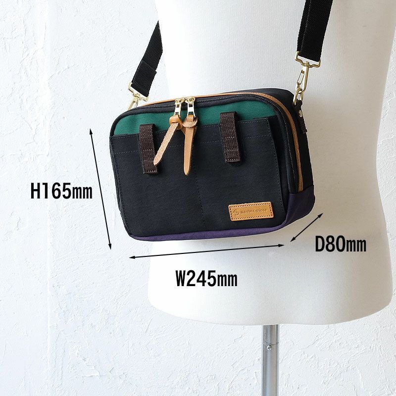 本体生地には、ナイロンのツイル地に特殊加工を施したものを使用しています。 タテ糸に 210d、ヨコ糸に 420d の生地に特殊加工を施すことで生地を収縮させ、 より密度を高めてコシを持たせています。 付属レザーは、クロム鞣しを施し染料で染めた後、表面を顔料で仕上げ、 その上から角シボ型押しをすることで表面の強度も増し、 ルックスも上品に仕上がっており、 最後に頭貼り(型押し凹凸のトップに色を乗せる)をすることで 陰影がハッキリとして奥行き感を表現しています。 ブラック × ゴールドの配色で仕上げたオリジナルのカラビナを ポイントにしたシリーズです。 (サコッシュ・ミニショルダー・チョークバッグ にはオリジナルカラビナはついておりません)