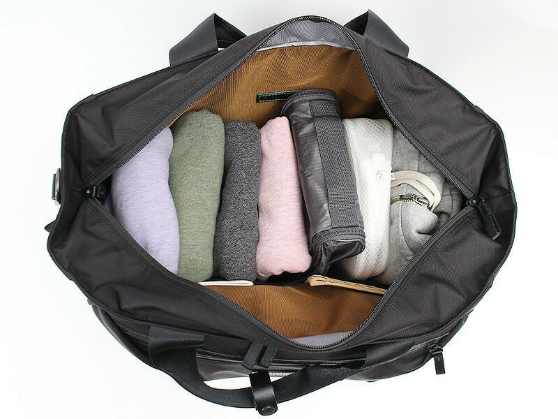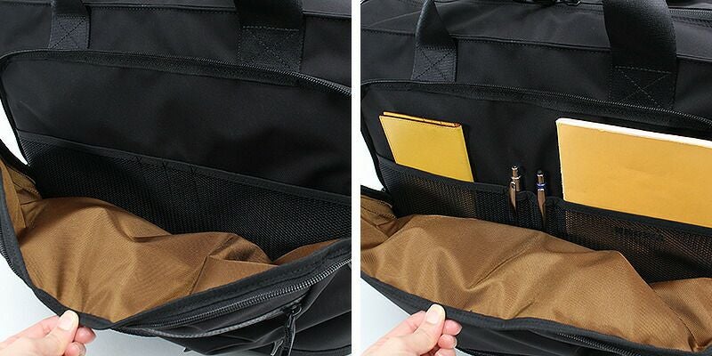大きく開き中身が見やすいファスナー行きのメイン収納になっており、メッシュポケットが2つついています。