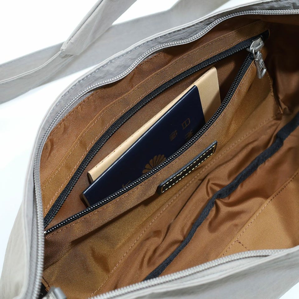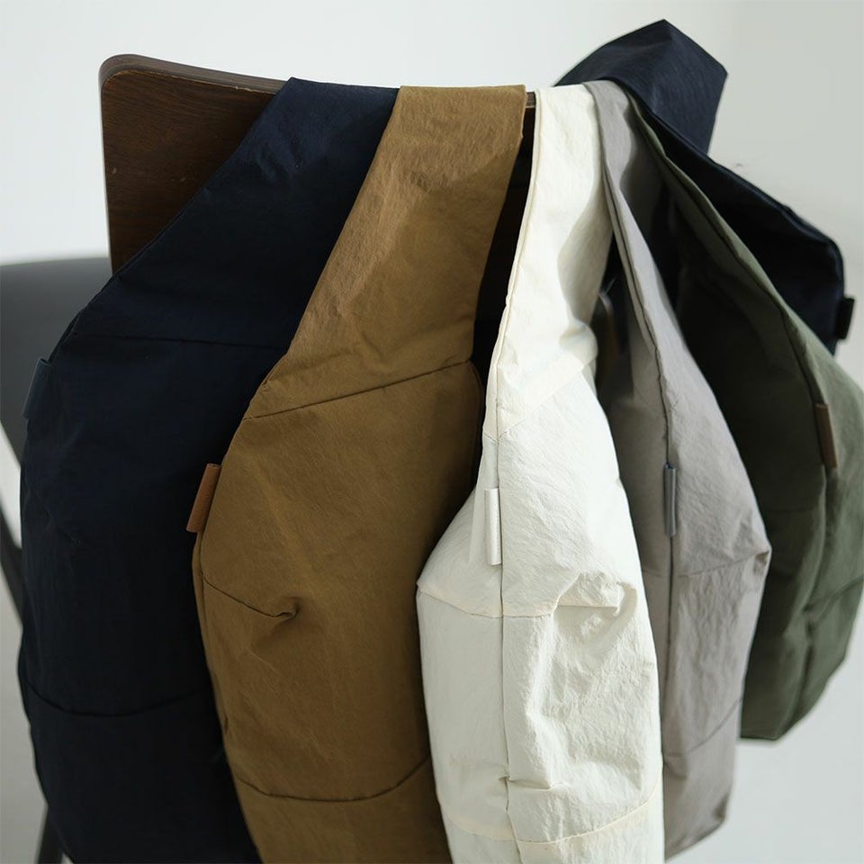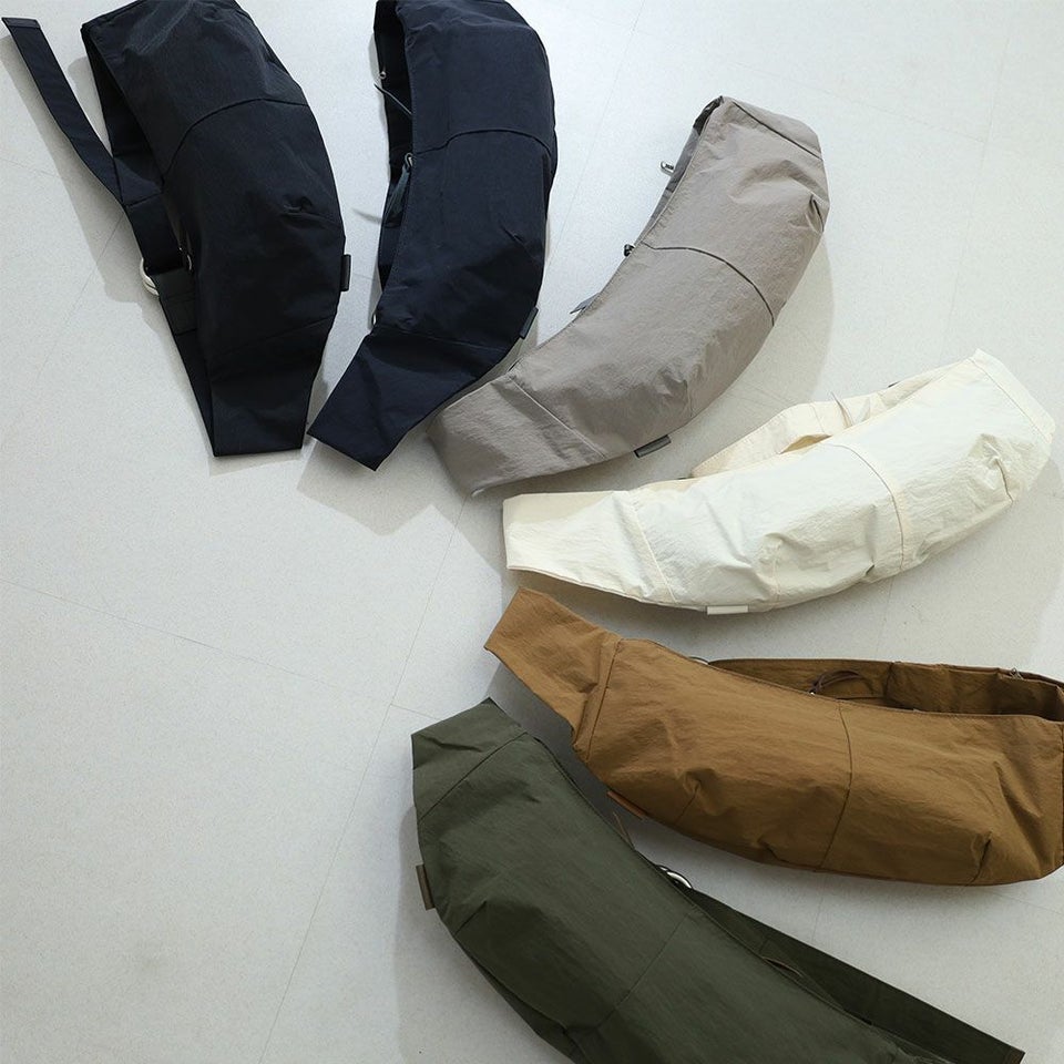 小松マテーレ(株)のKONBU-N加工を施したナイロンタッサーを採用。ハリとコシのある質感で自立するほどの硬度を持ちながら、驚くほど軽量。マットな風合いとシワ感がこなれた雰囲気を演出し、カジュアルにも上品にも馴染みます。