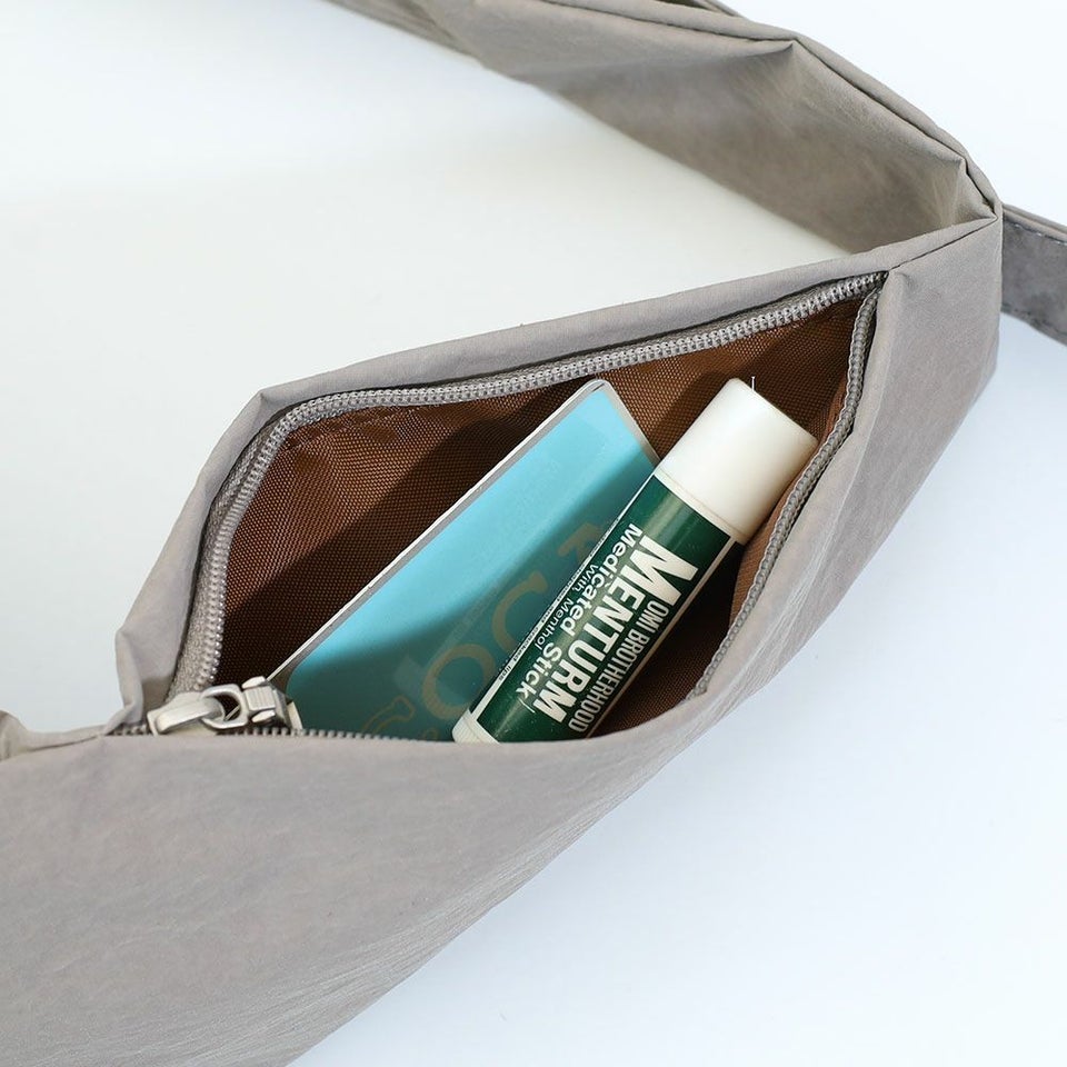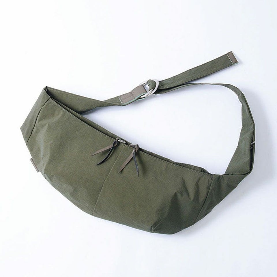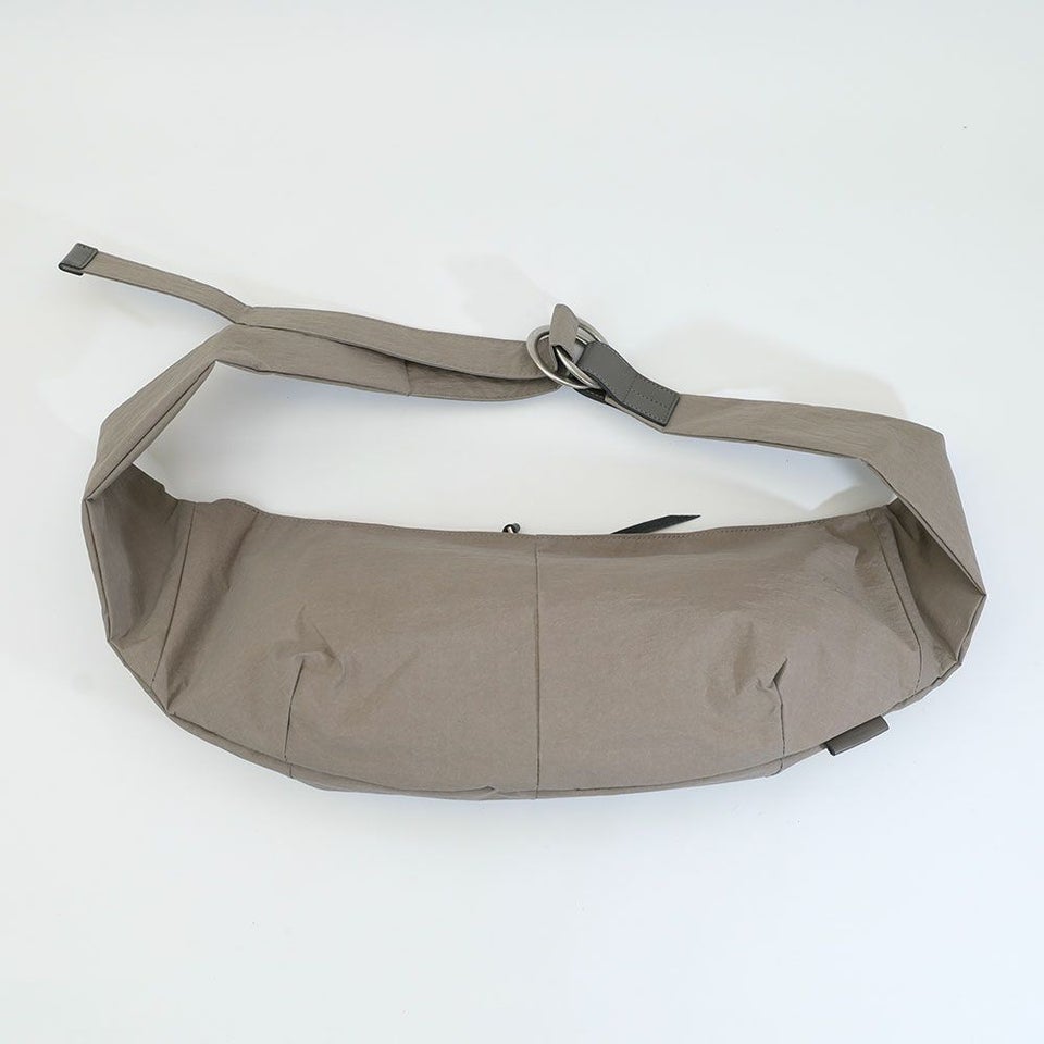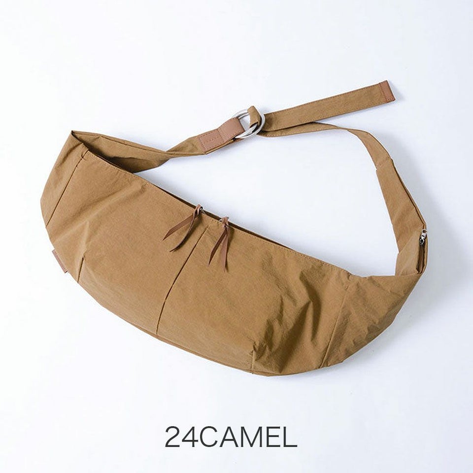 小松マテーレ(株)のKONBU-N加工を施したナイロンタッサーを採用。ハリとコシのある質感で自立するほどの硬度を持ちながら、驚くほど軽量。マットな風合いとシワ感がこなれた雰囲気を演出し、カジュアルにも上品にも馴染みます。