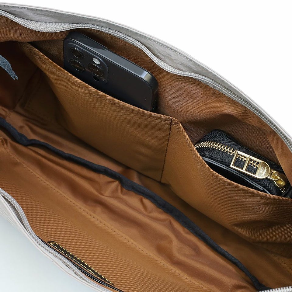 立体的なカッティングで見た目以上の収納力を実現。メイン収納にはファスナーポケットや小物ポケットを備え、整理がしやすい構造。さらに左右どちらからも開けられるダブルジップ仕様で、使い勝手にも優れています。