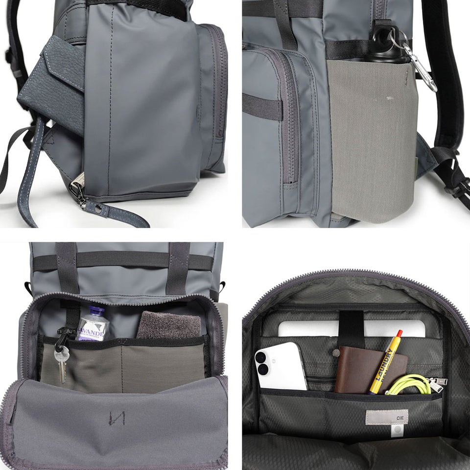 前面ラウンドファスナーポケットにはキーフックを装備し、鍵の紛失を防止。サイドのボトルポケットやファスナーポケットによりスマートフォンやパスケースも素早く取り出せます。移動中の動作をスムーズにします。