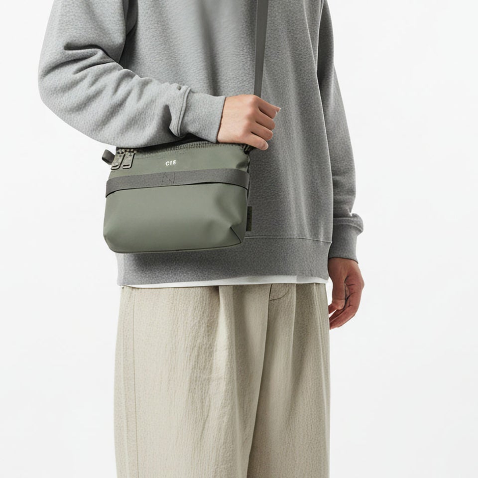 袋状の本体をセンターで吊り下げた構造により、前後2層のコンパートメントを確保。前後それぞれにZIPポケットを配置し、荷物の仕分けがしやすく、取り出しもスムーズです。