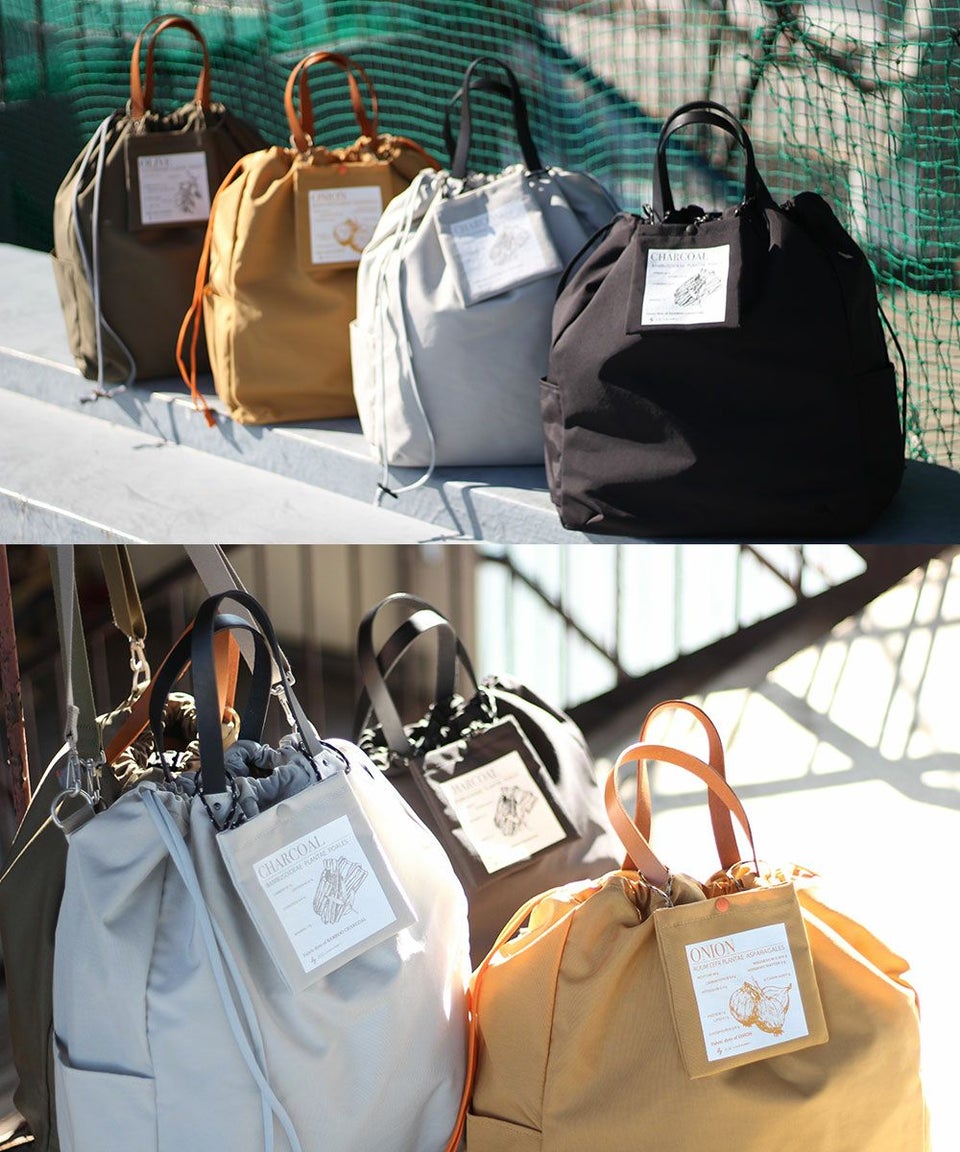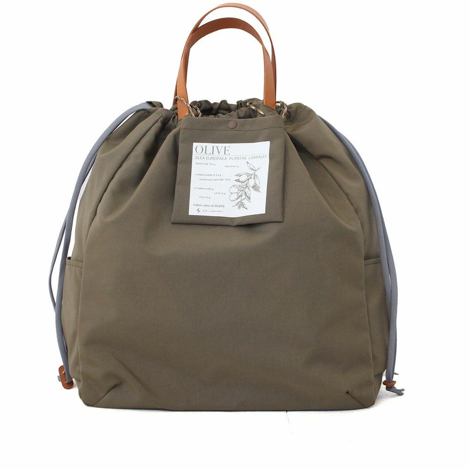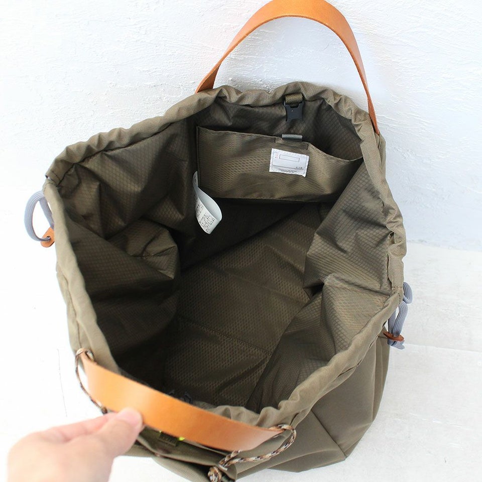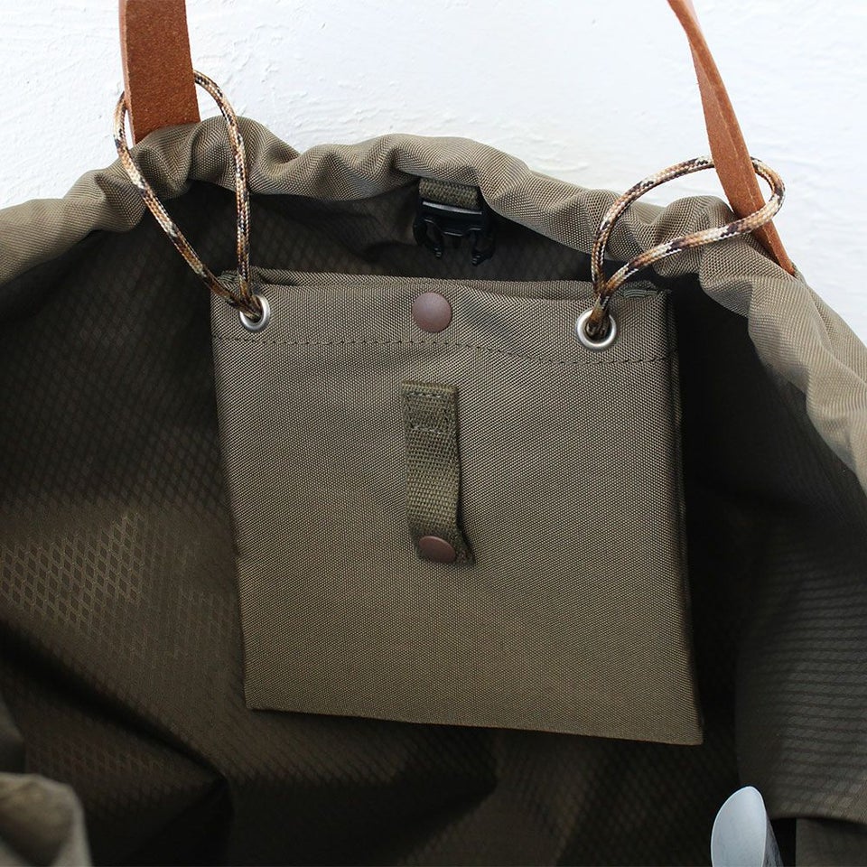 化学染料とは違った風合いのある優しい色に仕上がっており、環境考慮型のナイロンになります。付属にはベジタブルタンニンで鞣された、表面加工等を施していないナチュラルな風合いのレザーを使用しており、付属のポケットには染料で使われている植物をベースとしたオリジナルプリントを施しております。背面のロゴタグはリサイクルのシリコンで整形されたベースになりますので、様々な色のシリコンが混ざっておりひとつひとつ違う表情のタグになります。バッグの上部が巾着になっており、こちらのスピンドルコードもリサイクルポリエステルを使用しており、巾着にする事でスタイリングに併せた使い方ができます。