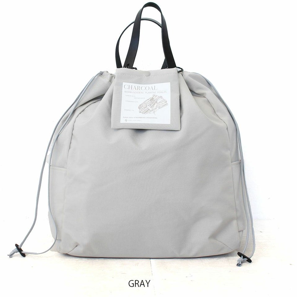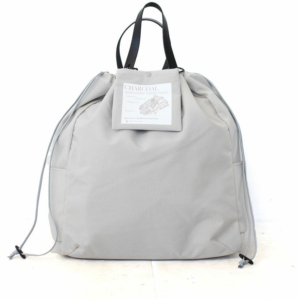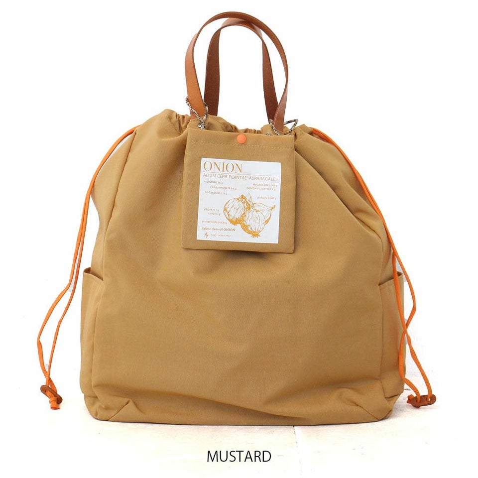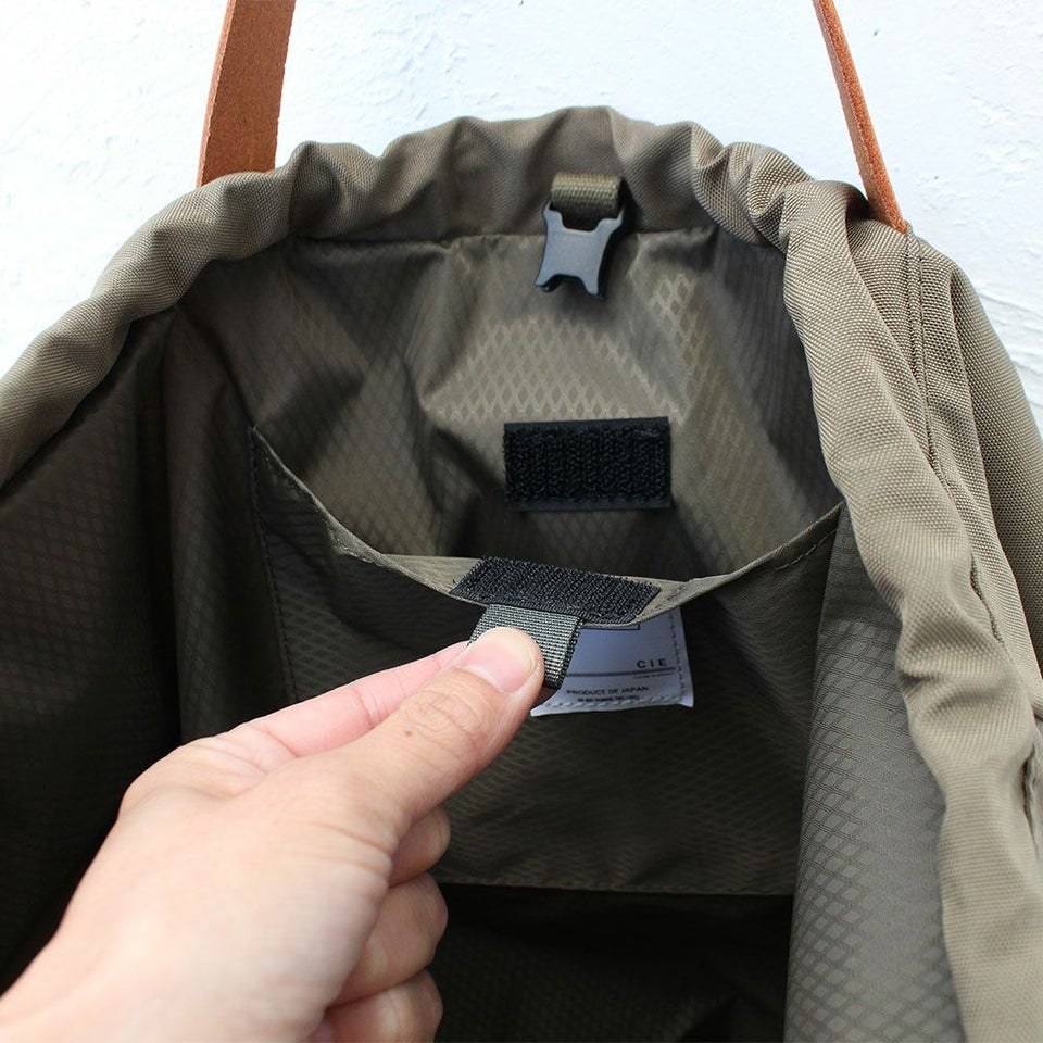 化学染料とは違った風合いのある優しい色に仕上がっており、環境考慮型のナイロンになります。付属にはベジタブルタンニンで鞣された、表面加工等を施していないナチュラルな風合いのレザーを使用しており、付属のポケットには染料で使われている植物をベースとしたオリジナルプリントを施しております。背面のロゴタグはリサイクルのシリコンで整形されたベースになりますので、様々な色のシリコンが混ざっておりひとつひとつ違う表情のタグになります。バッグの上部が巾着になっており、こちらのスピンドルコードもリサイクルポリエステルを使用しており、巾着にする事でスタイリングに併せた使い方ができます。
