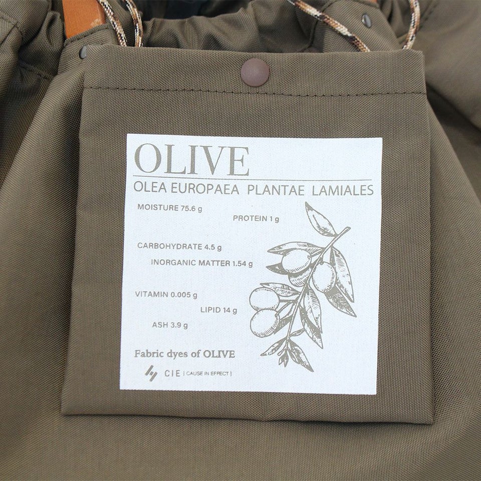 本体生地は、タスラン加工糸を使用したコットンライクなナイロンのベースに、タマネギの外皮から抽出されたケルセチンをベースに、様々な植物たち(オリーブの葉や、ぶどうの絞り殻、お米のもみ殻、竹炭等)の天然成分を配合し、染料として仕上げ生地染色をしております。