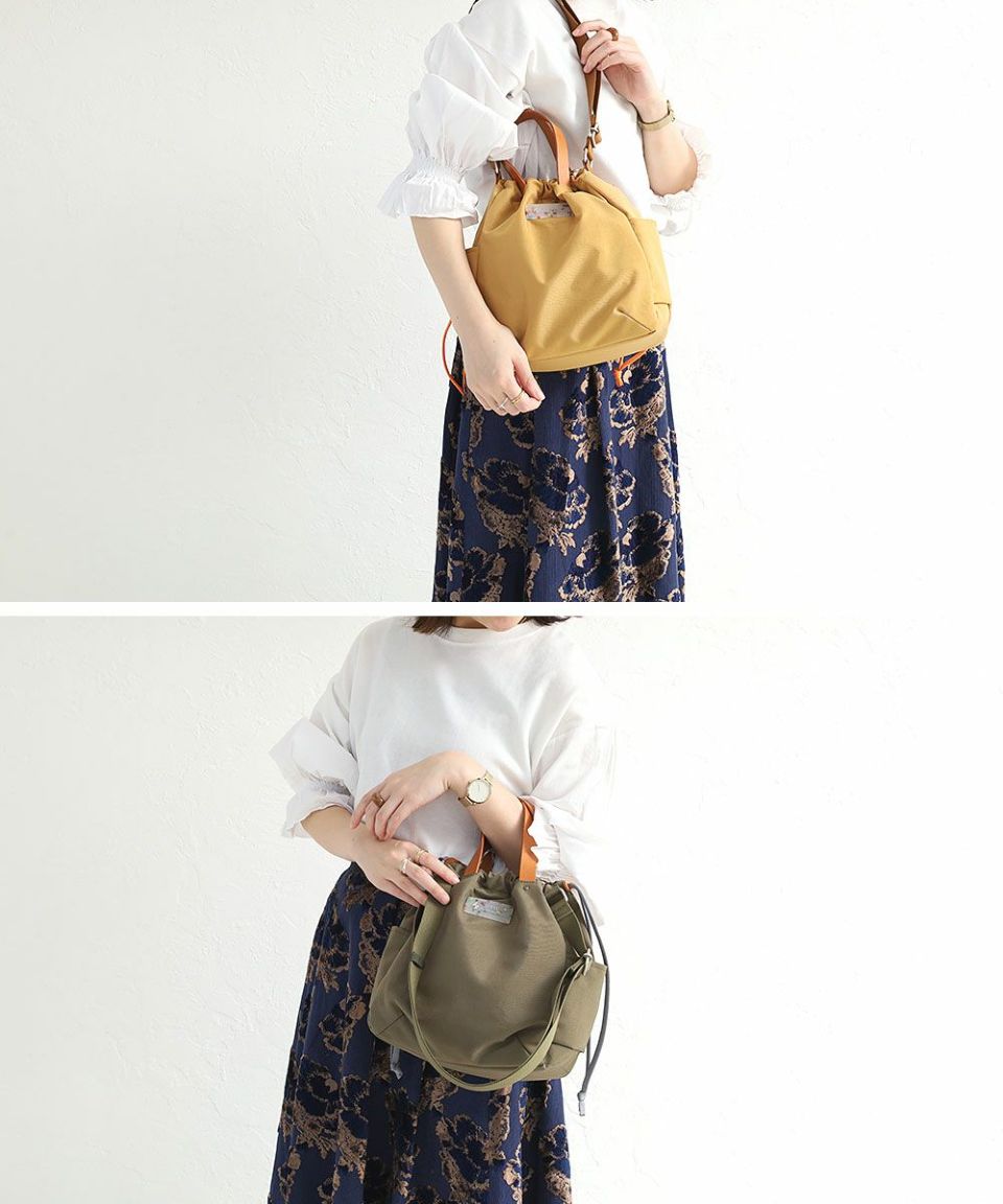 バッグの上部が巾着になっており、スピンドルコードもリサイクルポリエステルを使用しており、巾着にする事でスタイリングに併せた使い方ができます。