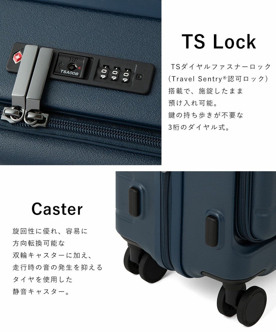 ●TSダイヤルファスナーロック: TSダイヤルファスナーロック(Travel Sentry(R)認可ロック)搭載で、施錠したまま預け入れ可能。鍵の持ち歩きが不要な3桁のダイヤル式。