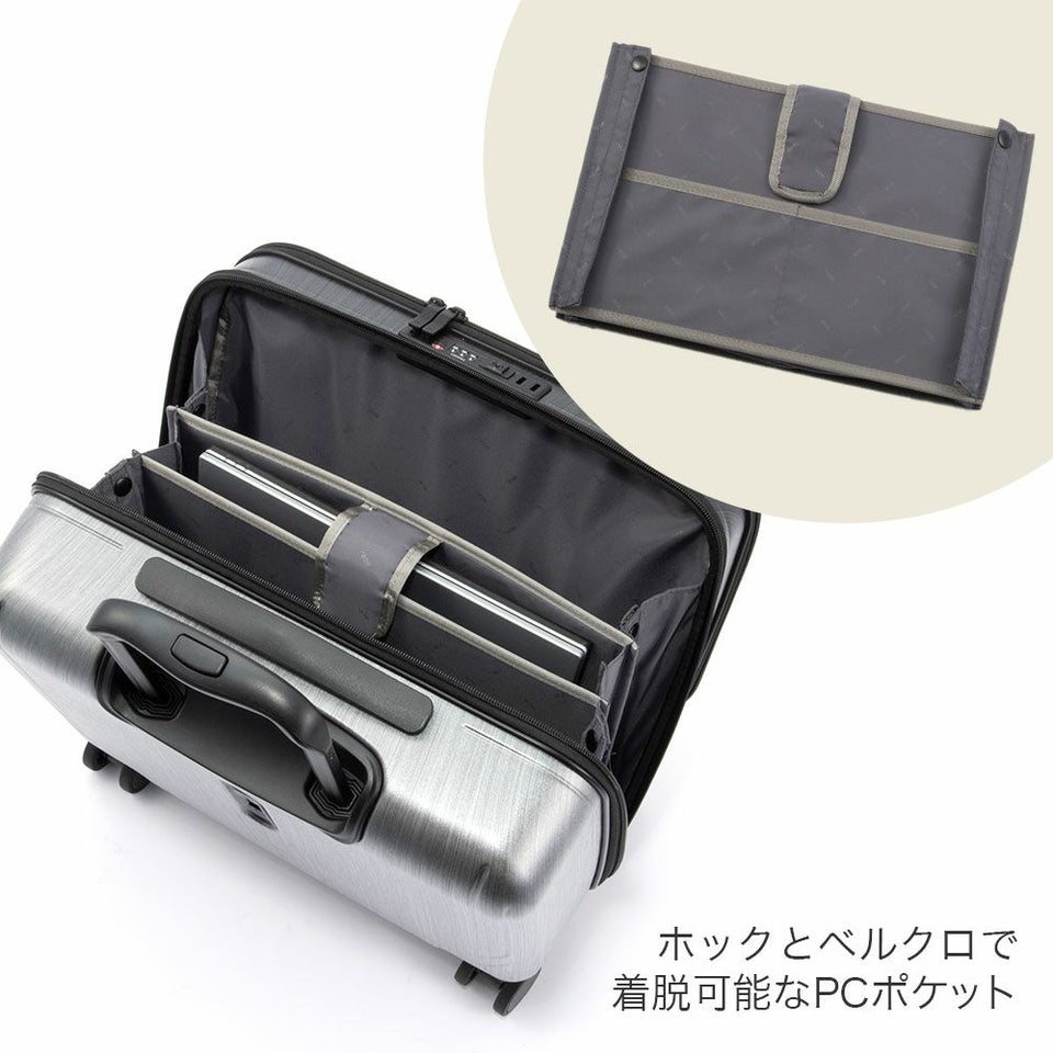 3桁のダイヤル式TSロックを採用し、鍵不要でセキュリティも万全。さらに本体とフロントポケットの両方を施錠できるデュアルロック仕様で、海外出張時も安心。機能美と安全性を兼ね備えた、ビジネスプロフェッショナルにふさわしい設計です。