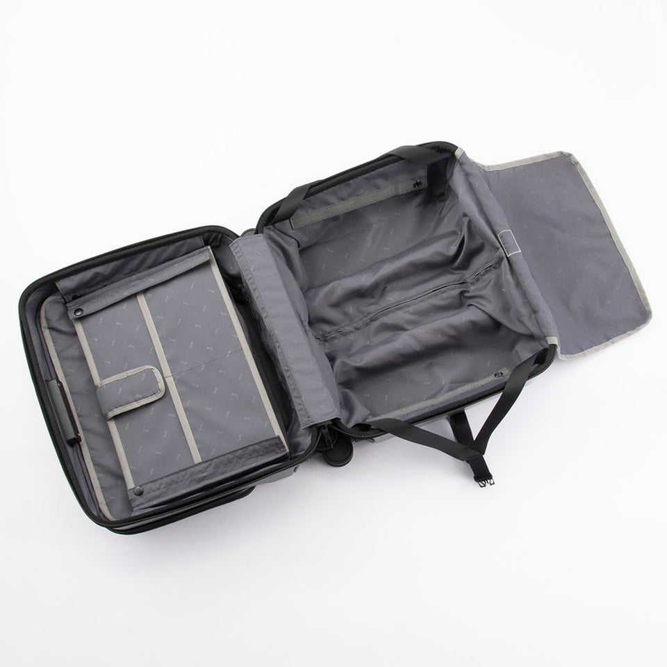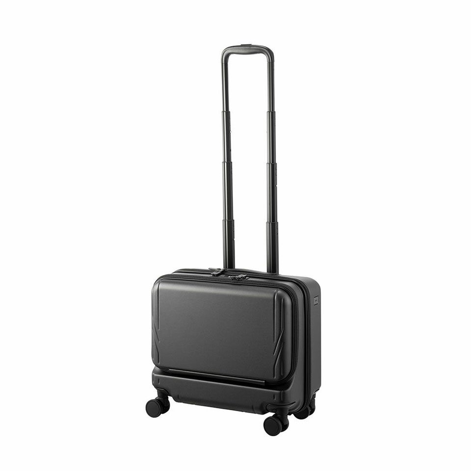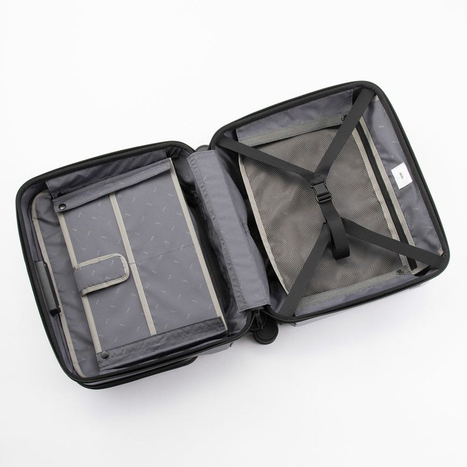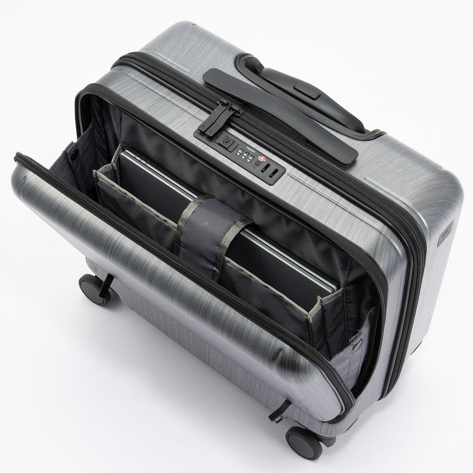 バッグを上にセットアップしやすいヨコ型タイプを採用。ビジネスバッグとの組み合わせもスムーズで、移動時の安定感も抜群。機内持ち込み可能なサイズ感で、出張や短期滞在に最適な使い勝手を実現しています。