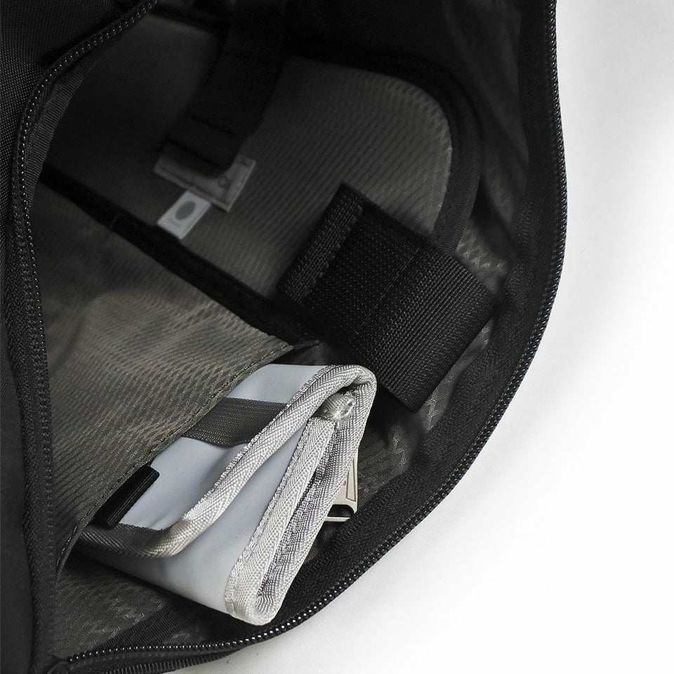 背面サイドに設けられた貫通ZIPにより、肩にかけたまま内部へ直接アクセス可能。さらに内部には小物収納用のコンパクトポケットを配置し、鍵やカードなどの出し入れもスムーズに行えます。