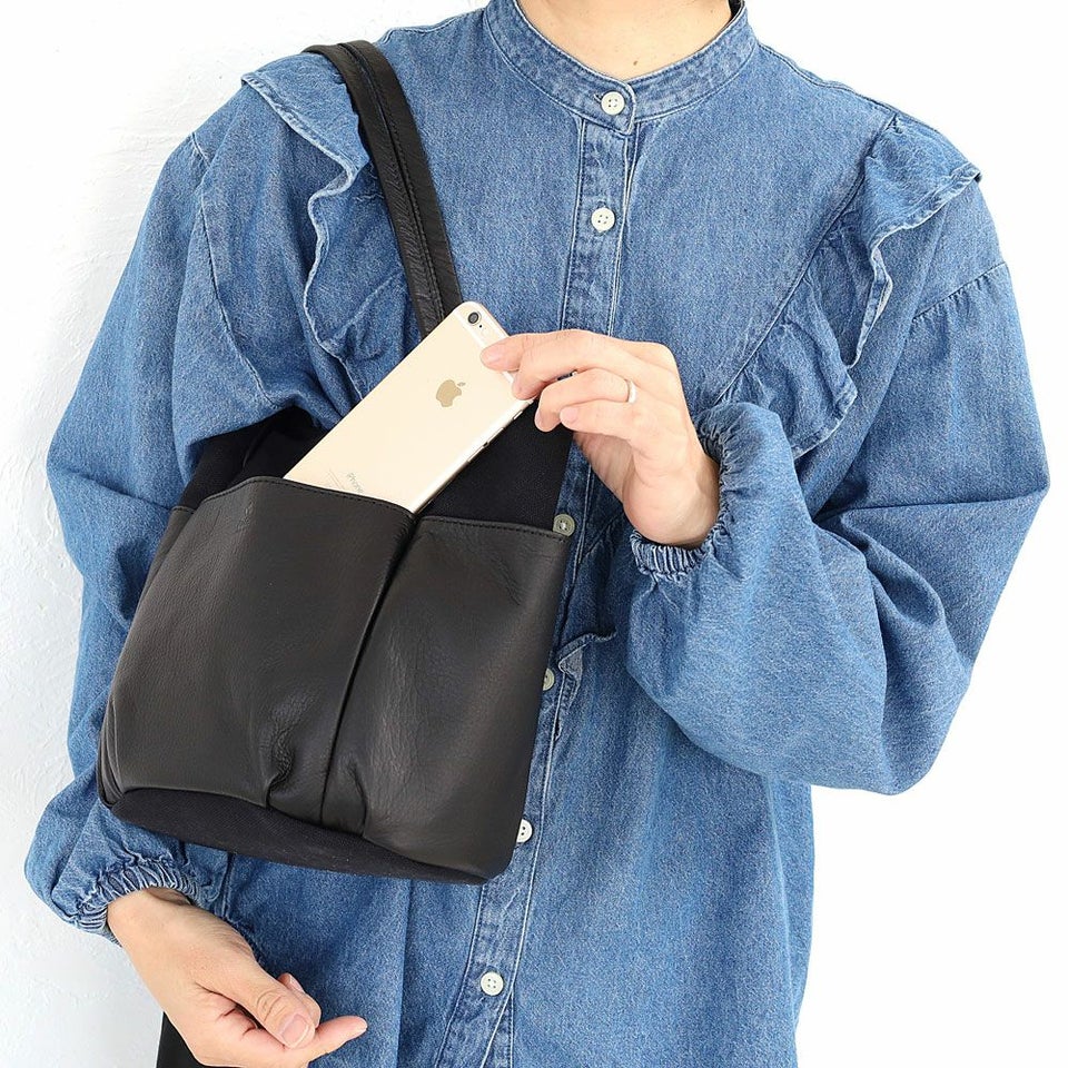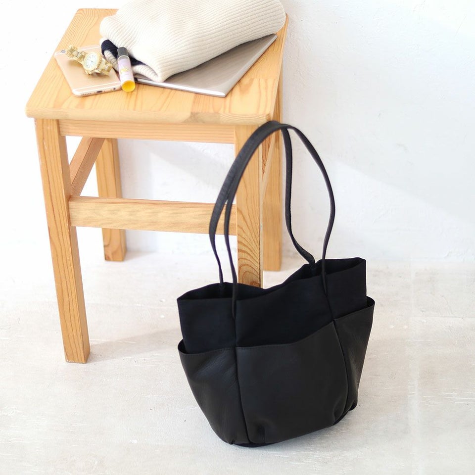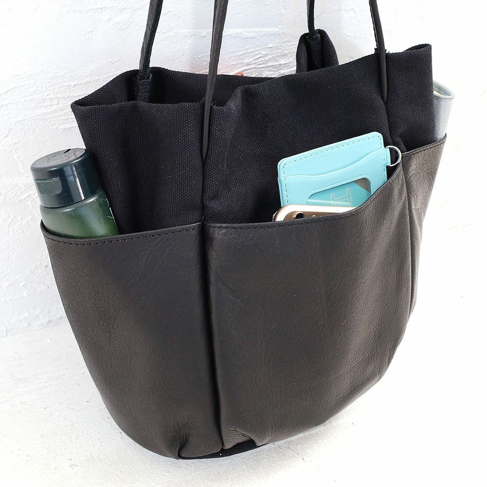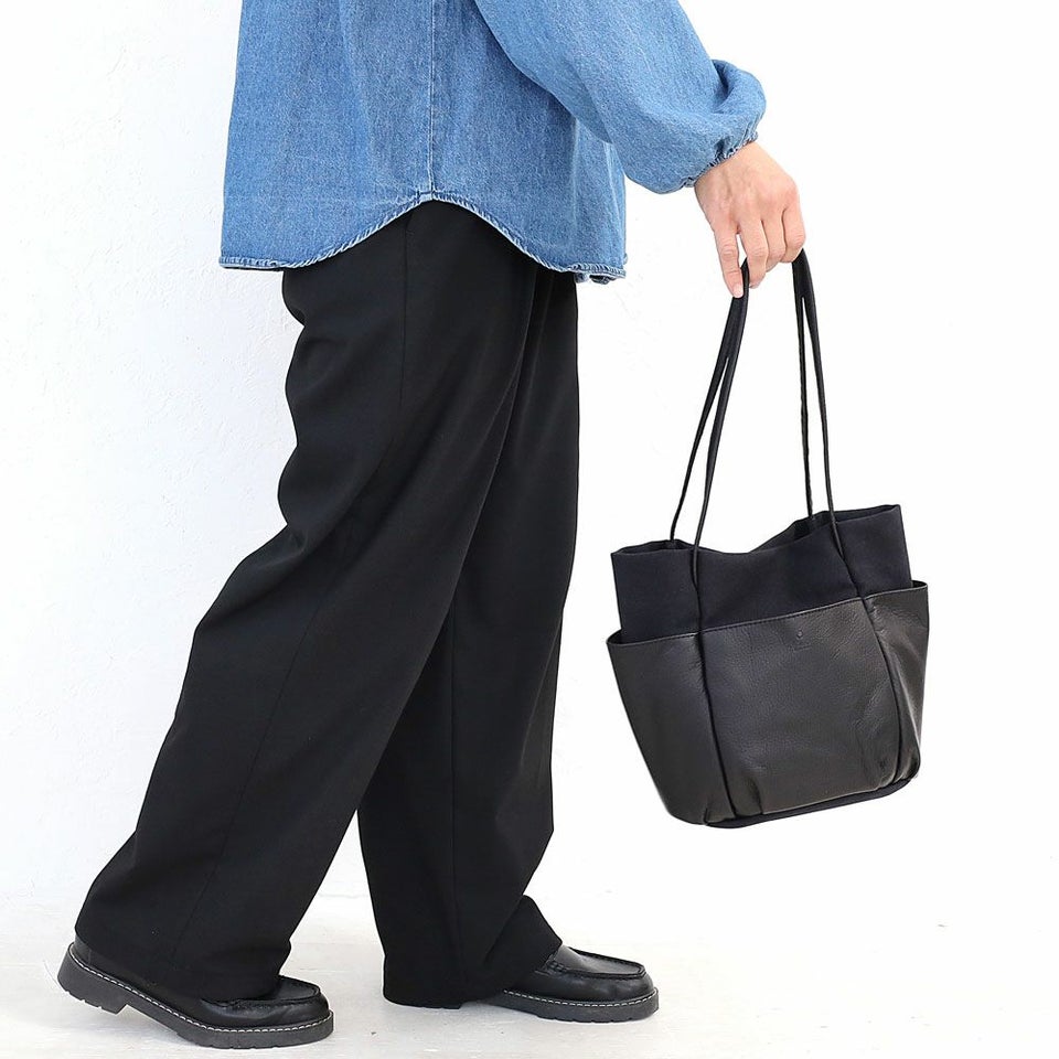 経年変化を楽しみやすいソフトなタッチ感の牛革と、ビンテージ加工でほどよいこなれ感を出したキャンバスを組み合わせた、シンプルでナチュラルなムードのレザーバッグです。 外側に配置された革のポケットは、ガーデニングバッグやツールバッグからインスピレーションを受け、タウンユースにデザインをアレンジしています。 革は国内産の牛革をチョイス、人の手で1枚ずつ丁寧に手塗でアンチック加工を施しており、ブラックカラーに深みと奥行きを出しています。使い続ける毎に変化する表情をお楽しみください。