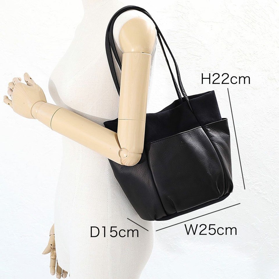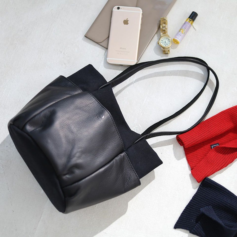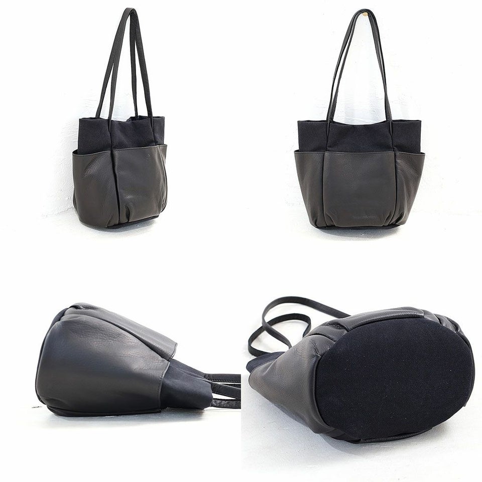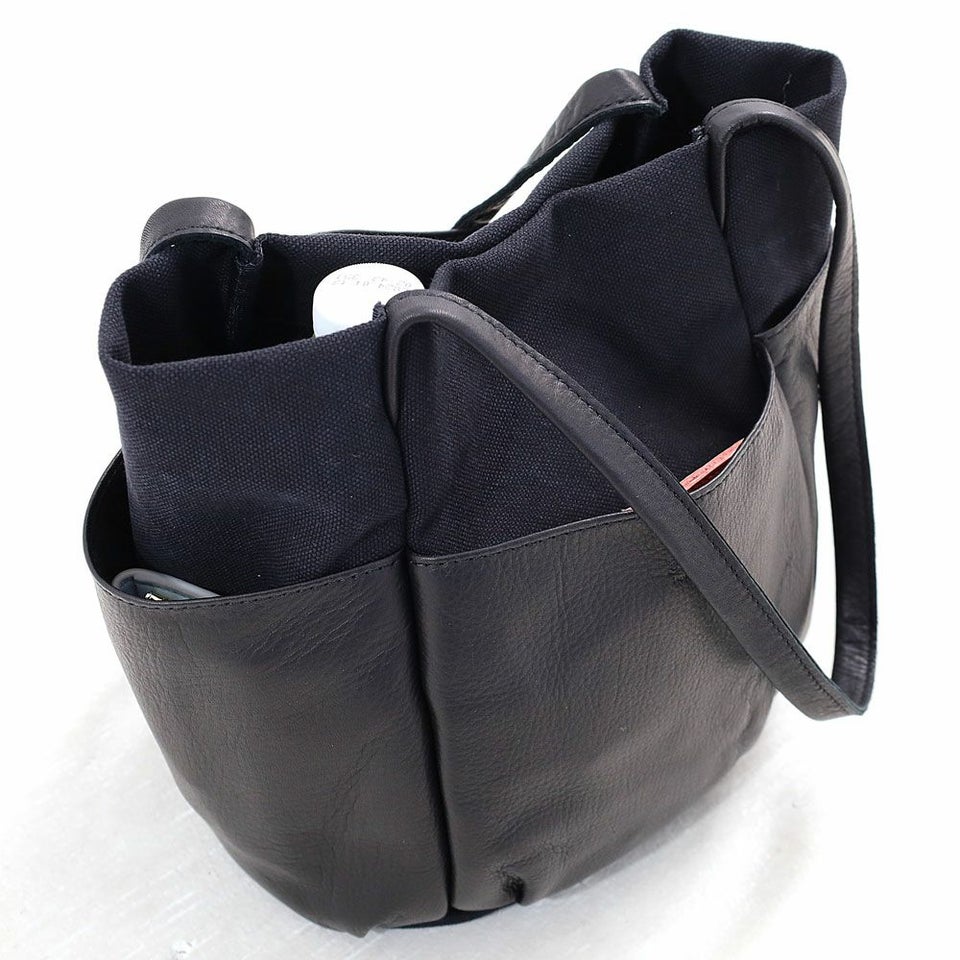 経年変化を楽しみやすいソフトなタッチ感の牛革と、ビンテージ加工でほどよいこなれ感を出したキャンバスを組み合わせた、シンプルでナチュラルなムードのレザーバッグです。 外側に配置された革のポケットは、ガーデニングバッグやツールバッグからインスピレーションを受け、タウンユースにデザインをアレンジしています。 革は国内産の牛革をチョイス、人の手で1枚ずつ丁寧に手塗でアンチック加工を施しており、ブラックカラーに深みと奥行きを出しています。使い続ける毎に変化する表情をお楽しみください。