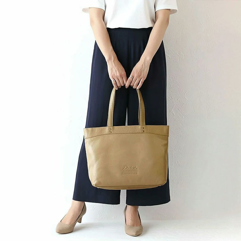 軽量でソフトな牛革を使用し通勤や通学など日常使いにぴったりの心地よい質感を実現しています。手に取った瞬間に分かる滑らかな触り心地と自然な艶が上品さを引き立て毎日のコーディネートにすっと馴染む仕上がりです。軽さと素材の良さを両立した使いやすいトートバッグです。