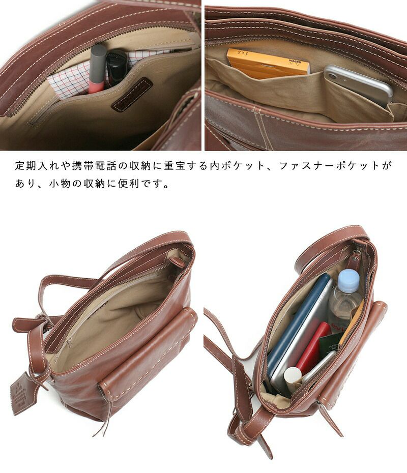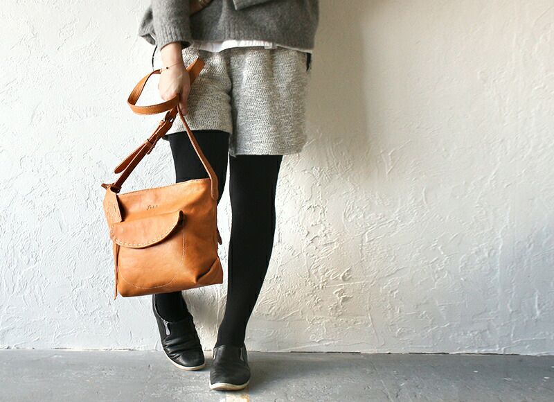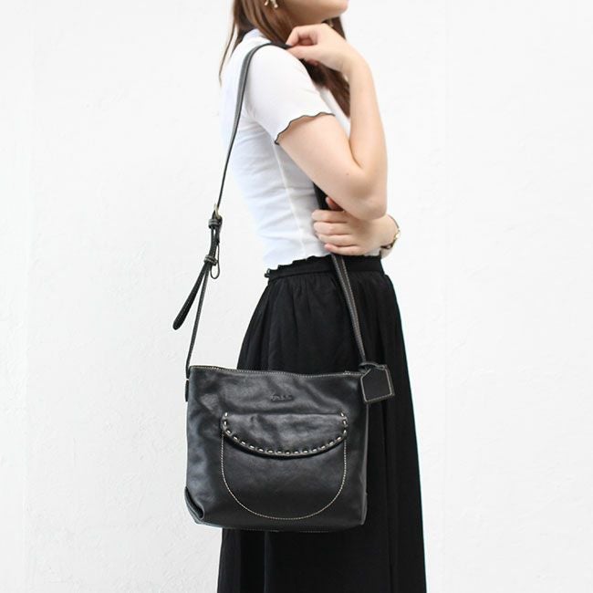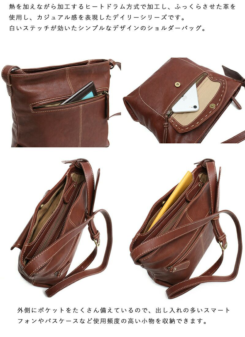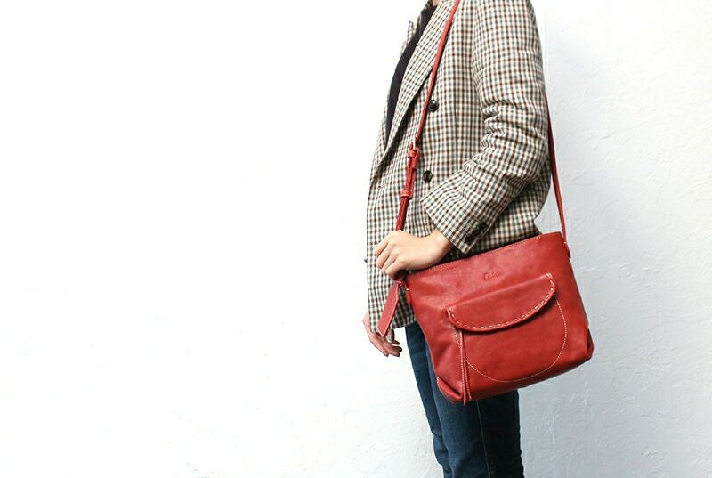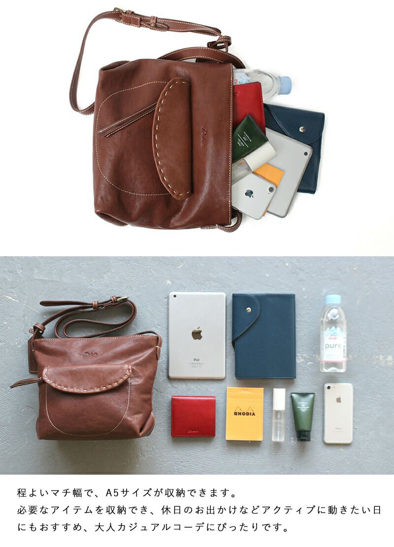 白いステッチが効いたシンプルなデザインのショルダーバッグで、 程よいマチ幅で体にフィット、休日のお出かけなどアクティブに動きたい日もおすすめです。