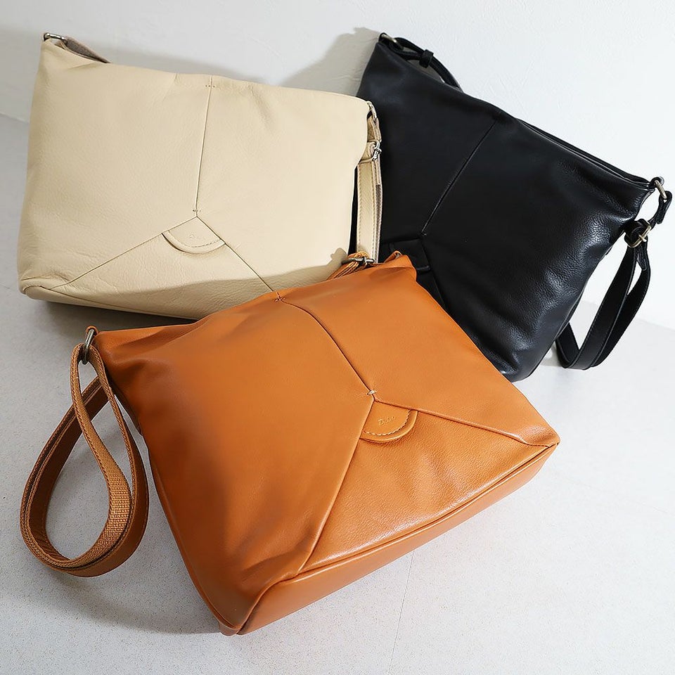 手に吸い付くようなしっとりとしたソフトレザーを使用し、幅広い世代に好まれる穏やかなタッチ感を実現。袋縫い仕立てで素材の柔らかさを最大限にいかし、見た目も手触りも優しい仕上がりに。肩に掛けても体にふんわりと馴染み、毎日の相棒として快適に使えます。