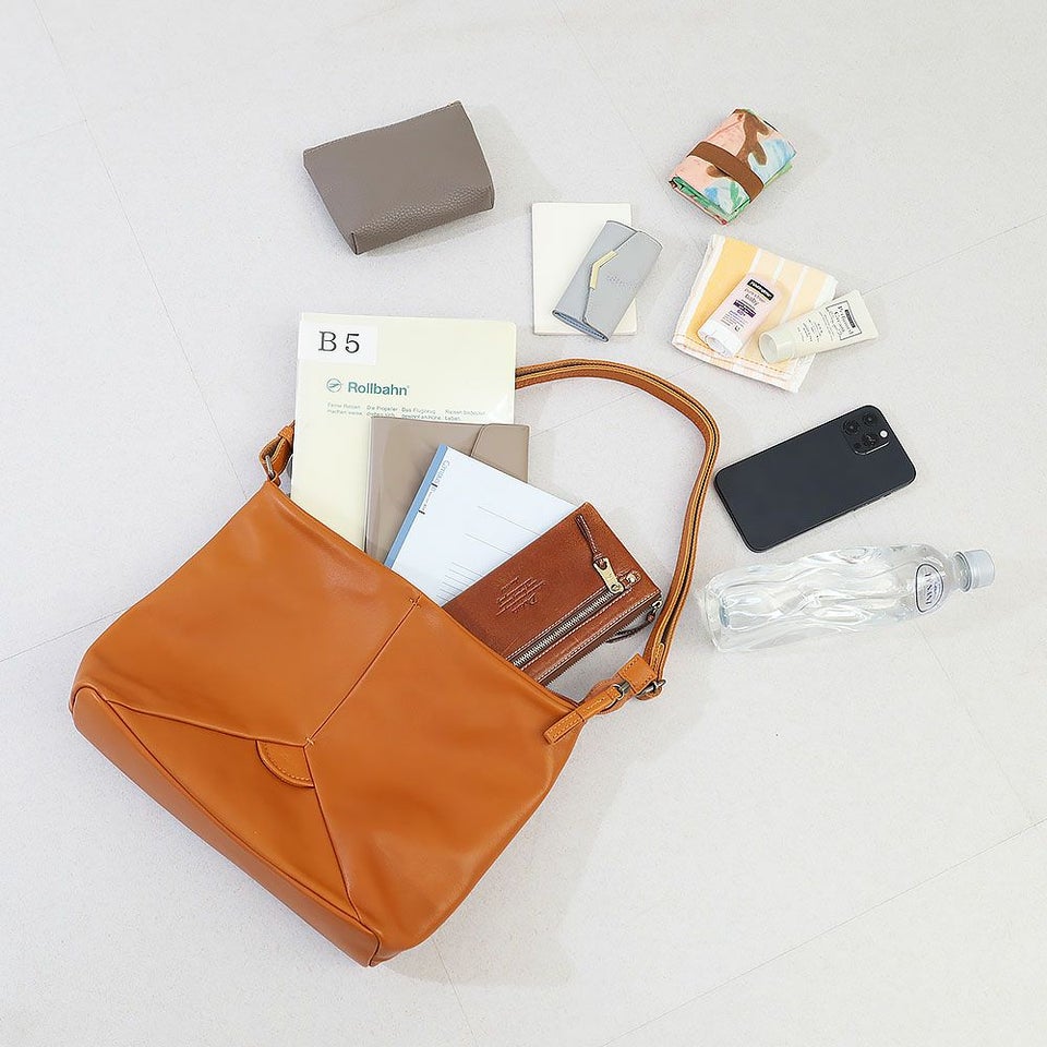 B5サイズが横にゆったり収まり、長財布やペットボトルも入れやすい絶妙なサイズ感。内部にはファスナーポケットとオープンポケットが二つあり、小物や貴重品を整理しながら収納できます。必要なものをすぐ取り出せる実用的なレイアウトが魅力です。