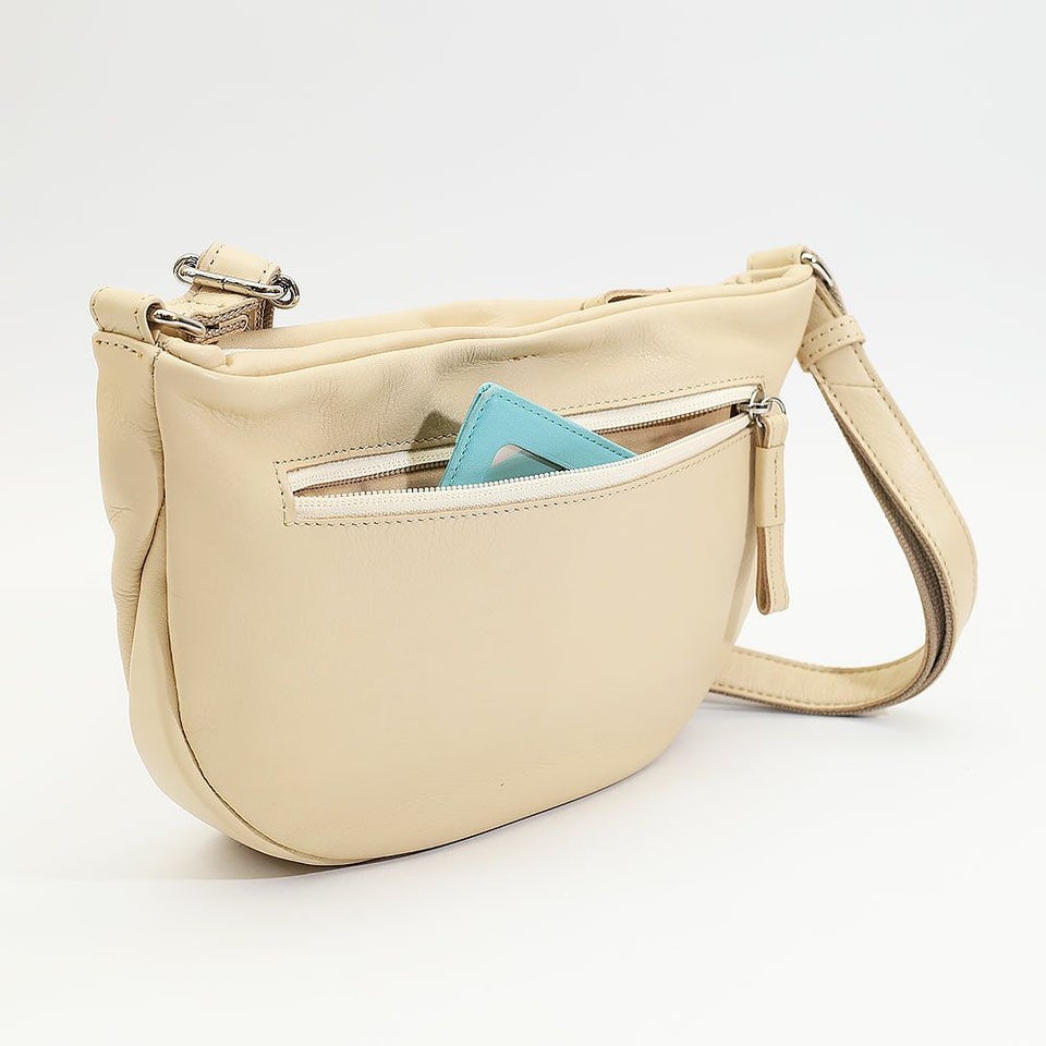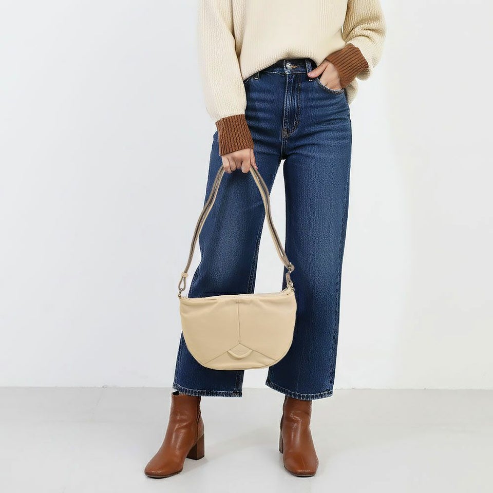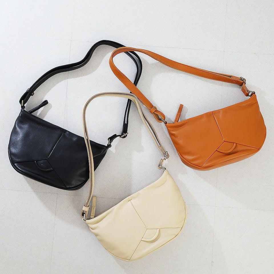 半円のコンパクトな形ながら開口部が大きく開くため、長財布も出し入れがスムーズです。内部にはファスナーポケットとオープンポケットを備え、小物の整理もしやすい構造。必要な物にすぐ手が届く扱いやすさで、毎日のストレスを軽減してくれます。