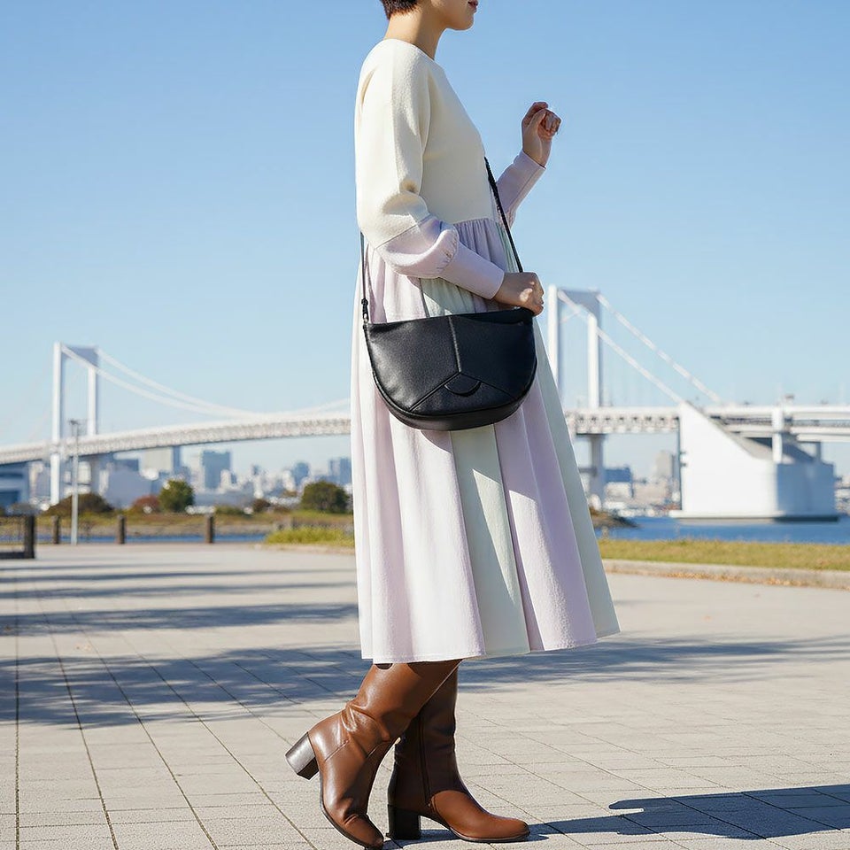 幅広い世代に支持されるソフトレザーを使用し、手に吸い付くようなしっとりとした質感が魅力です。袋縫い仕立てで素材本来の柔らかさをいかし、持つだけでやさしい印象に。毎日のコーデにも自然になじむ心地よさで、使うたびに愛着が深まるバッグです。