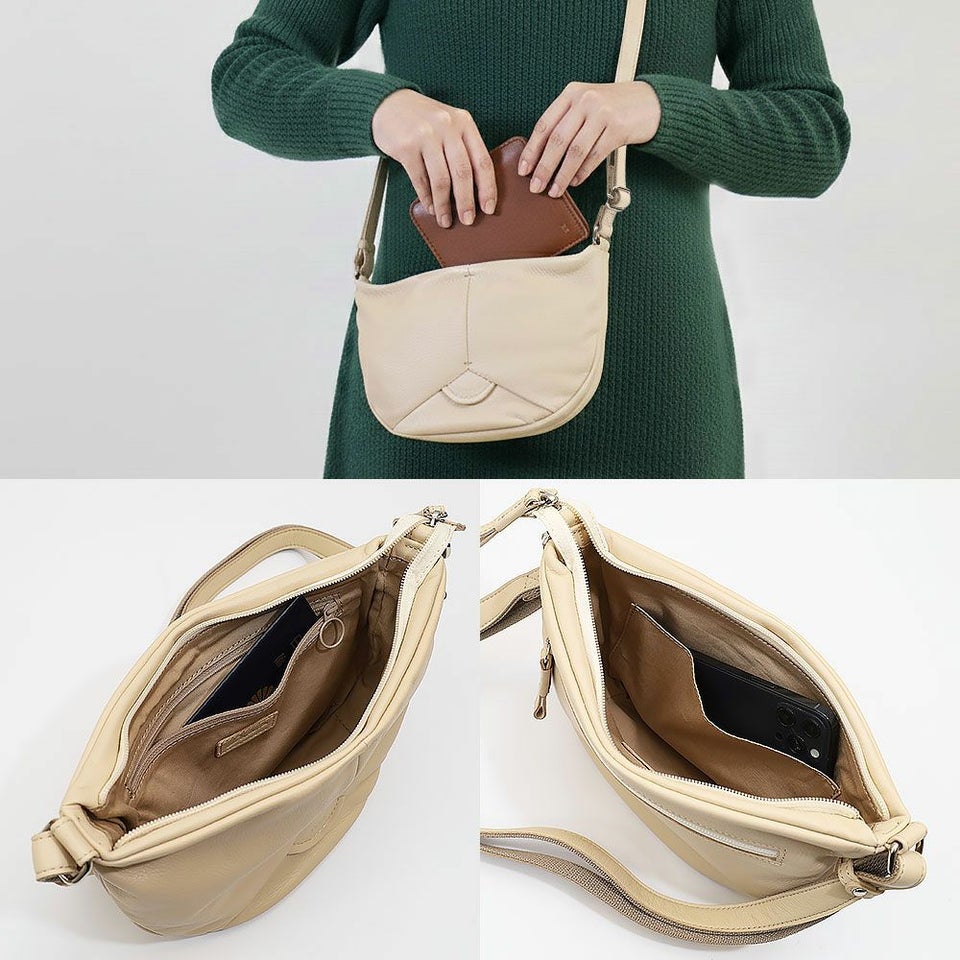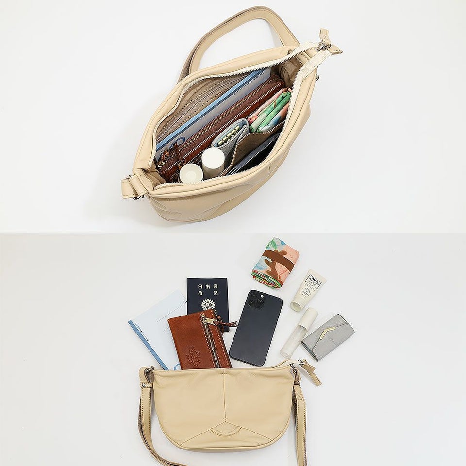 柔らかな本体に対して底からサイドにかけて芯材を入れることで、荷物を入れてもシルエットが崩れにくい設計です。ショルダーベルトは肩掛けも斜め掛けも可能で、裏面にコットンテープを採用し快適な掛け心地を実現。美しさと使いやすさの両方を叶える仕上がりです。