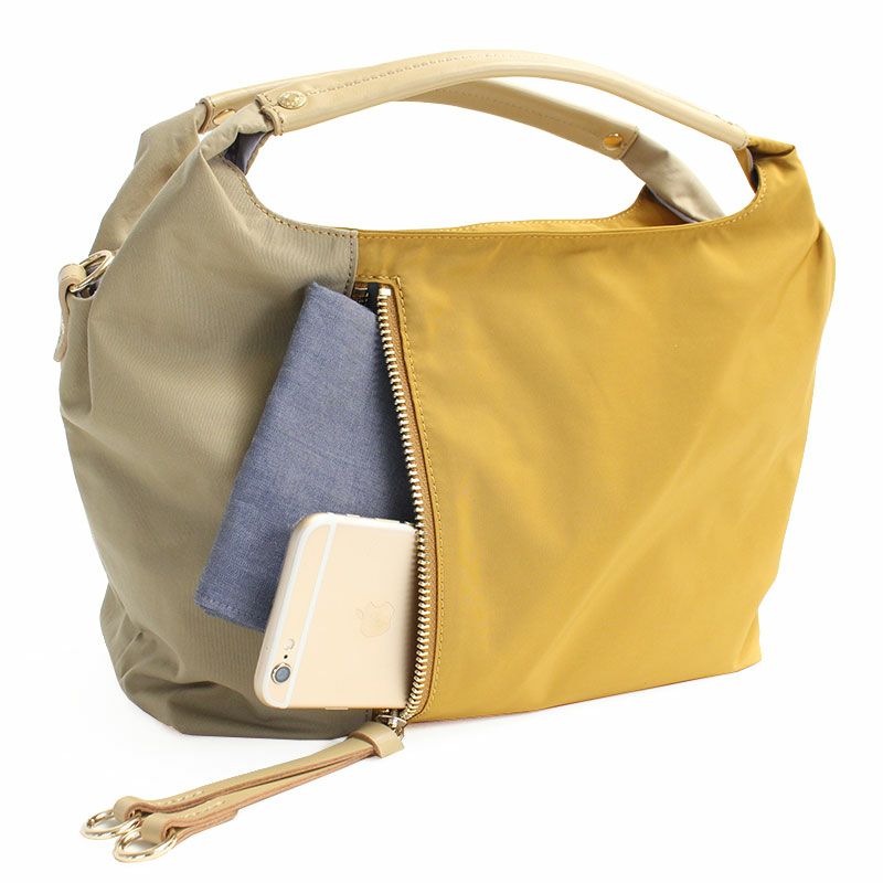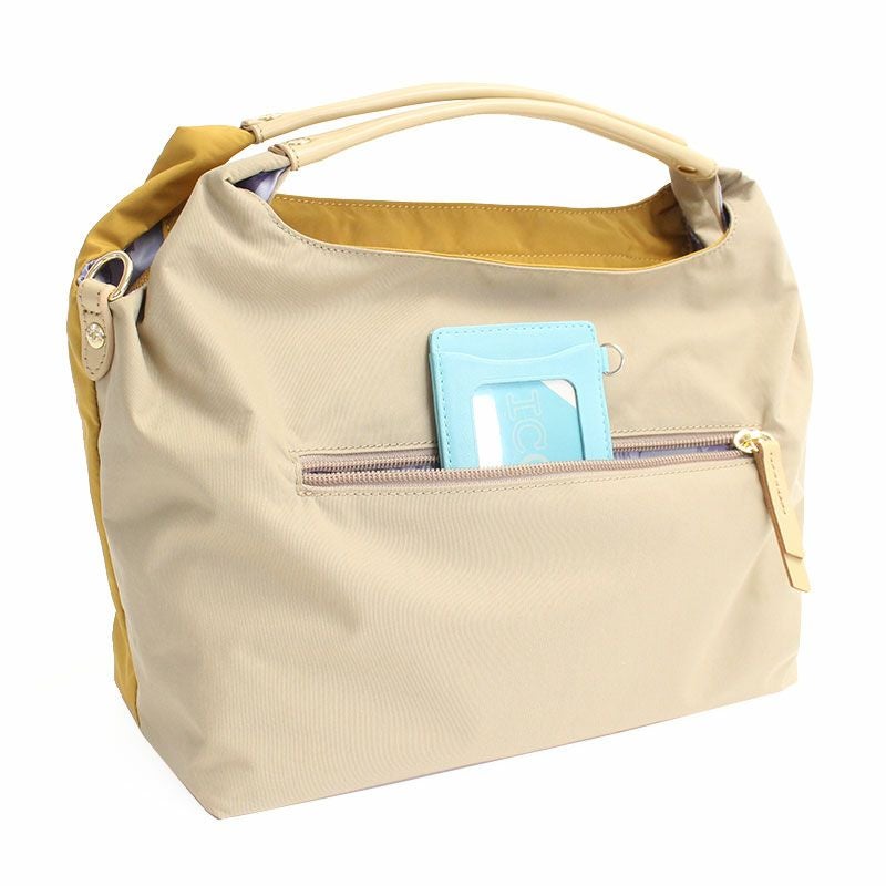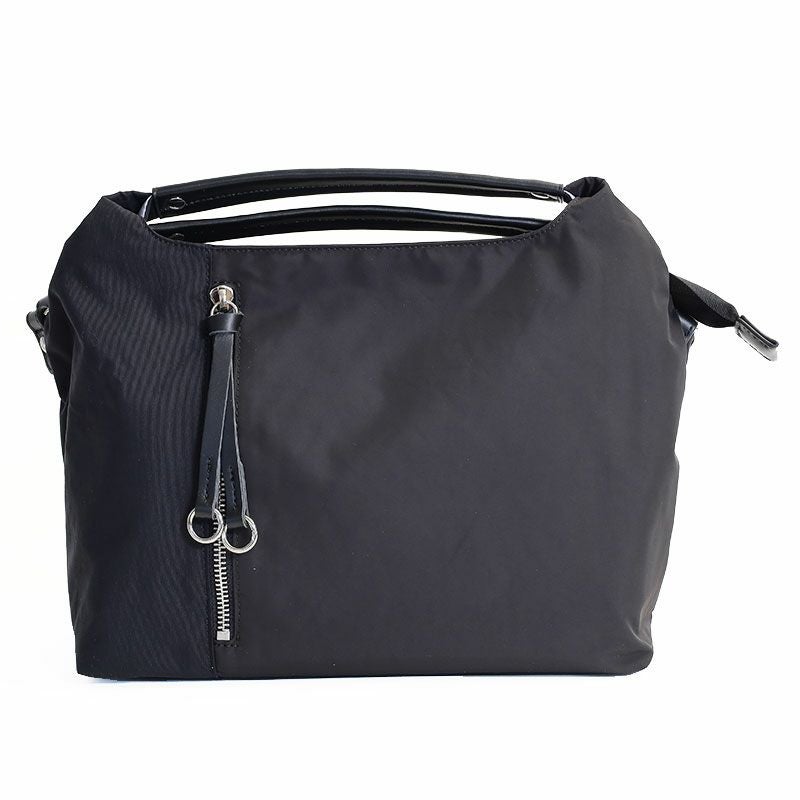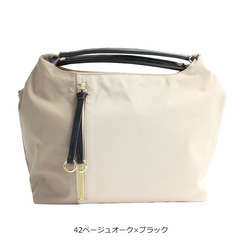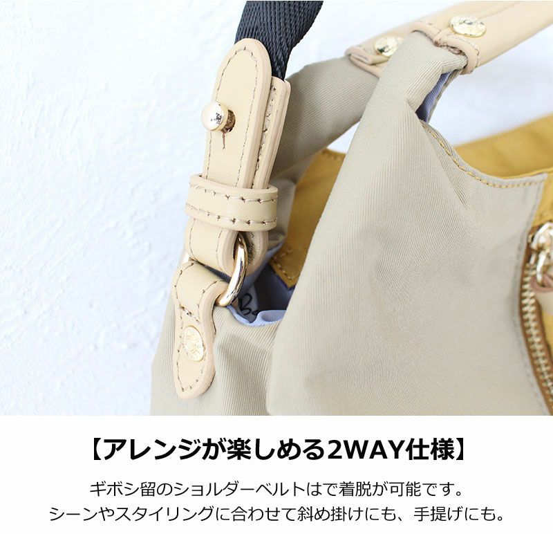 普段使いから通勤にも使えるきれいめ2wayバッグ。柔らかい質感のふんわり軽いナイロン素材で、雨の日も快適に使える耐久撥水仕様です。
