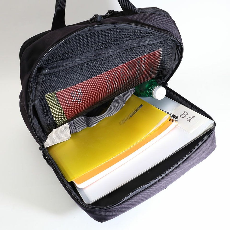 メインコンパートメントはA4サイズがすっきり収まり開口部が大きく開くため書類やタブレットの出し入れがとてもスムーズです。毎日の通勤や移動のストレスを軽減し必要なものを手早く管理できる実用的な設計が魅力です。