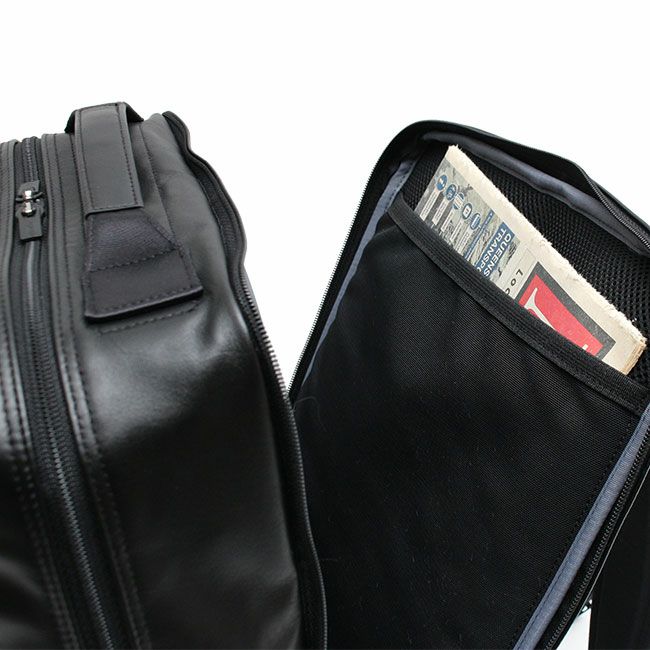 内装の生地にはテフロン(R)ファブリックプロテクター加工を施し、高い撥水性と防汚効果があります。 布帛カバンの作りを採用したシンプルなデザインなので、レザーのビジネスバッグでもフォーマルすぎない印象に仕上げており、より幅広い年齢の方にお使いいただけます。また要所にナイロン生地を使用しているので軽量に仕上がっているのも特徴です。
