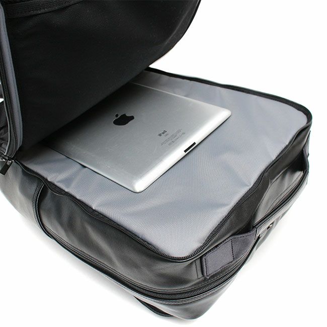 スタンダードなルックスに高い機能性を備えたビジネスシリーズ「TIME」としての特徴はそのままに、メイン素材を革にアップグレードし、全体をブラックワントーンにすることで上品でシックな印象に。スコッチガードTM加工によりお手入れも簡単。レザーでありながらフォーマルすぎず、より幅広い年齢の方にお使いいただけます。