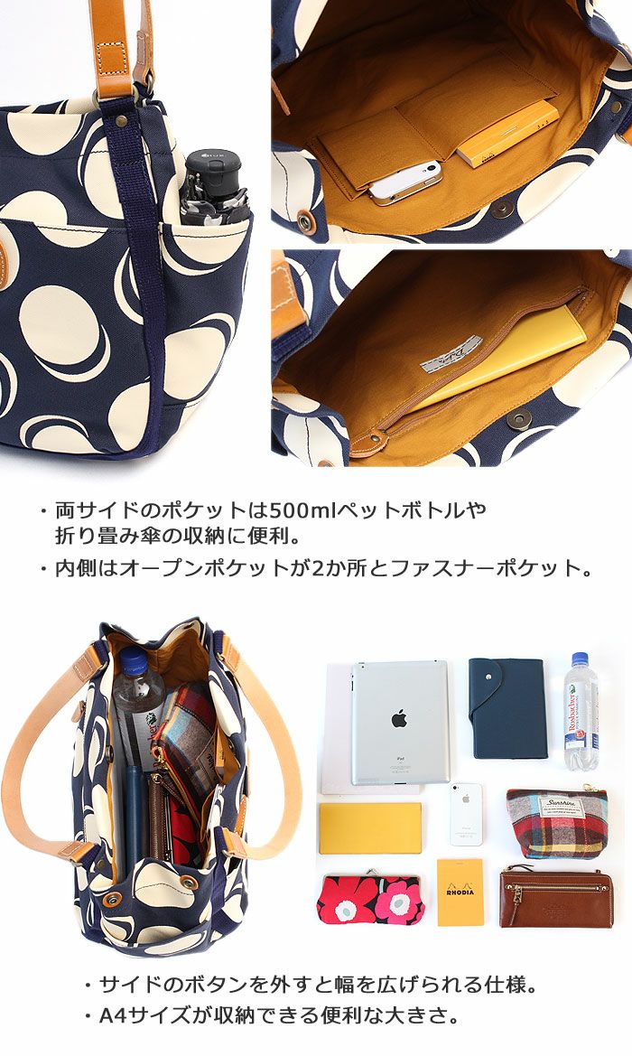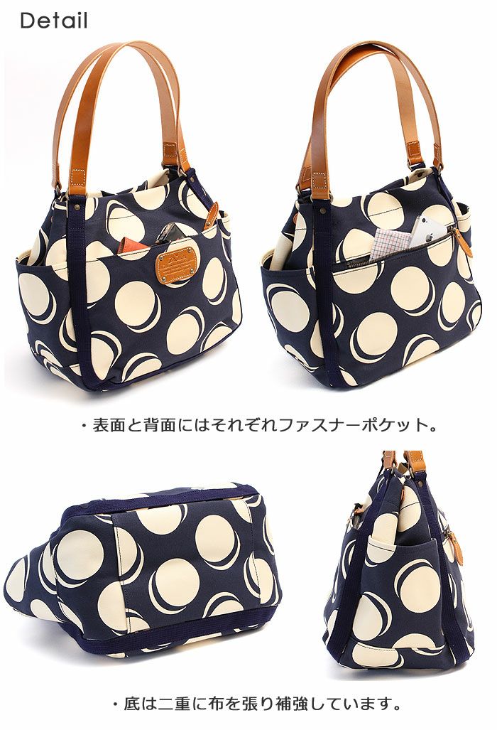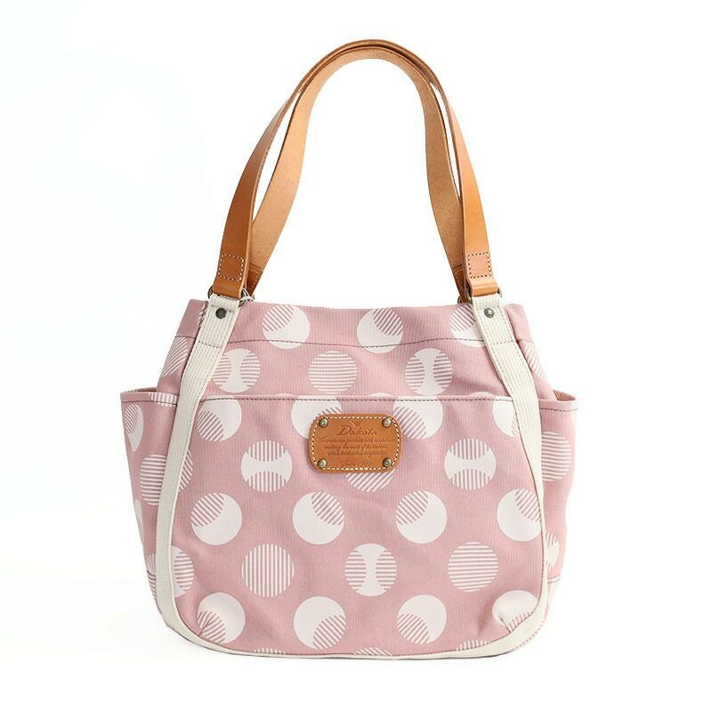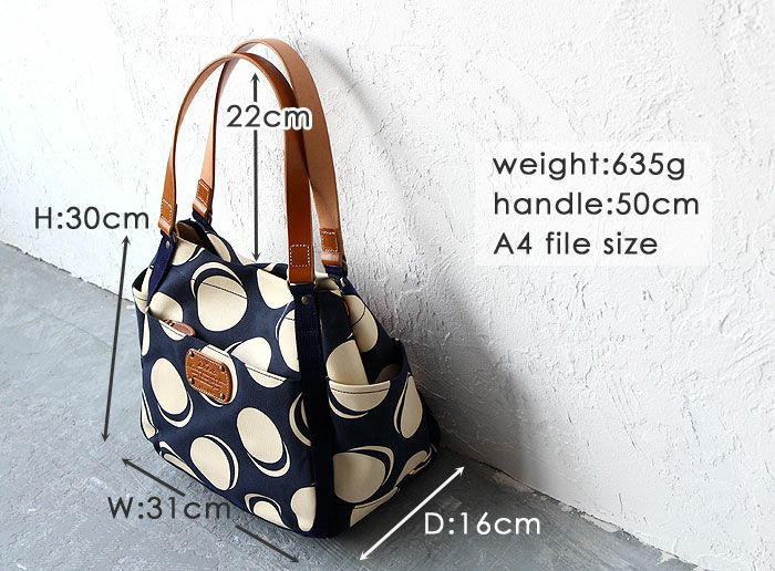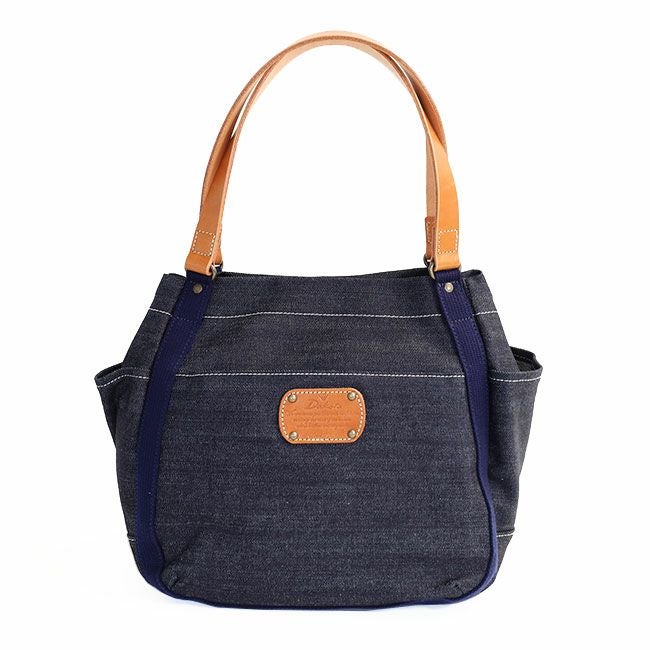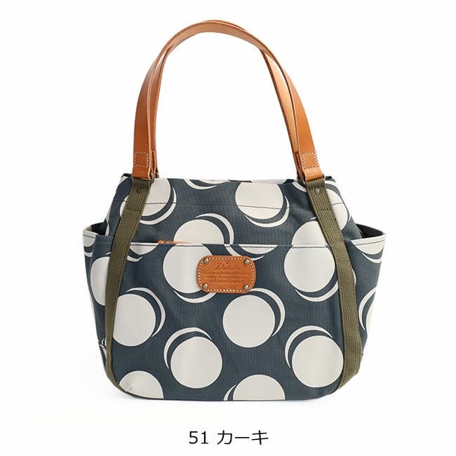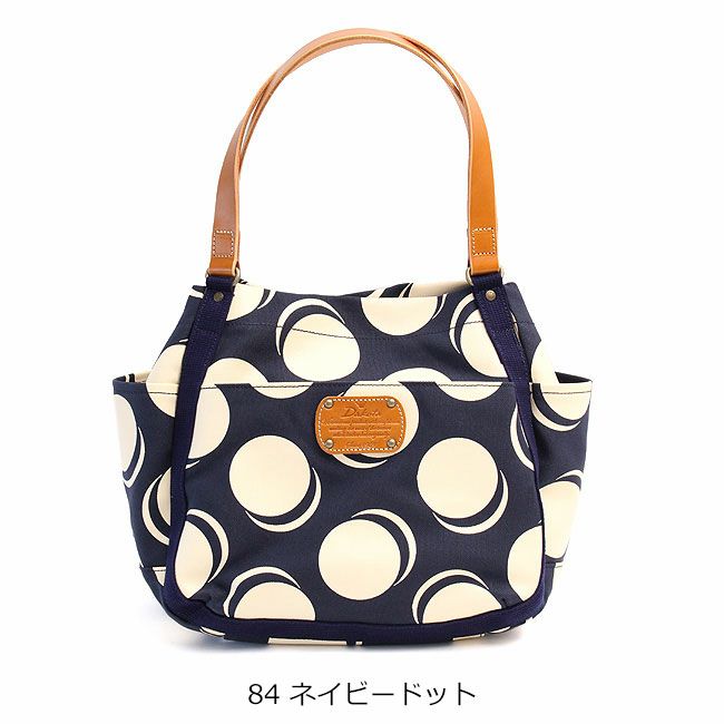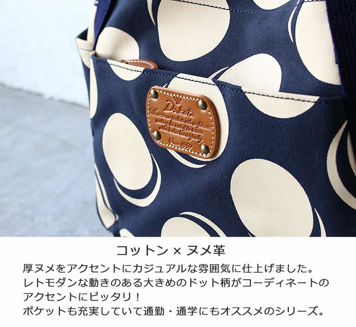 動きのある大きめのドット柄のコットンと爽やかなデニム生地に厚ヌメ革を合わせたざっくりトートバッグ。丸みのあるシンプルフォルムと、カジュアルなボディに厚ヌメ革を合わせた仕上がりが魅力的です。デザイン性はもちろん、ポケットを豊富に備えた使い勝手の良さもポイント。バラつく小物類をスッキリと整理整頓できる実用的なつくりになっています。