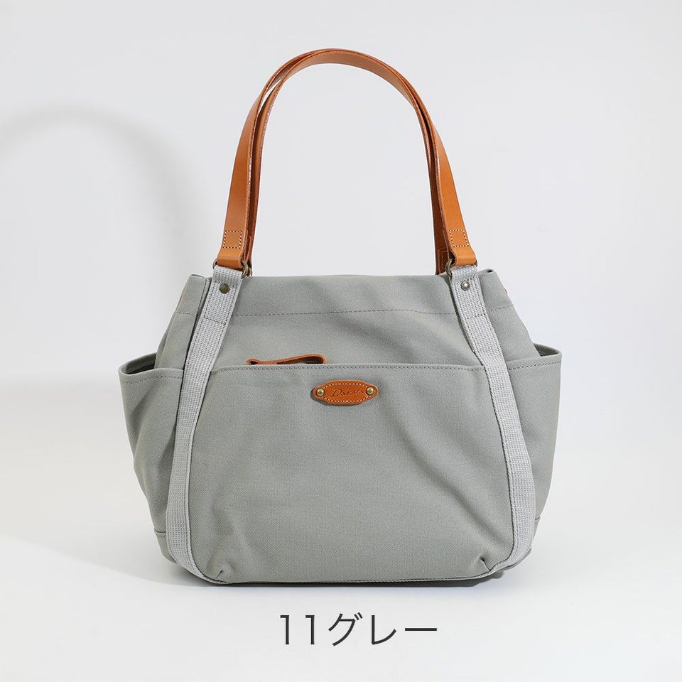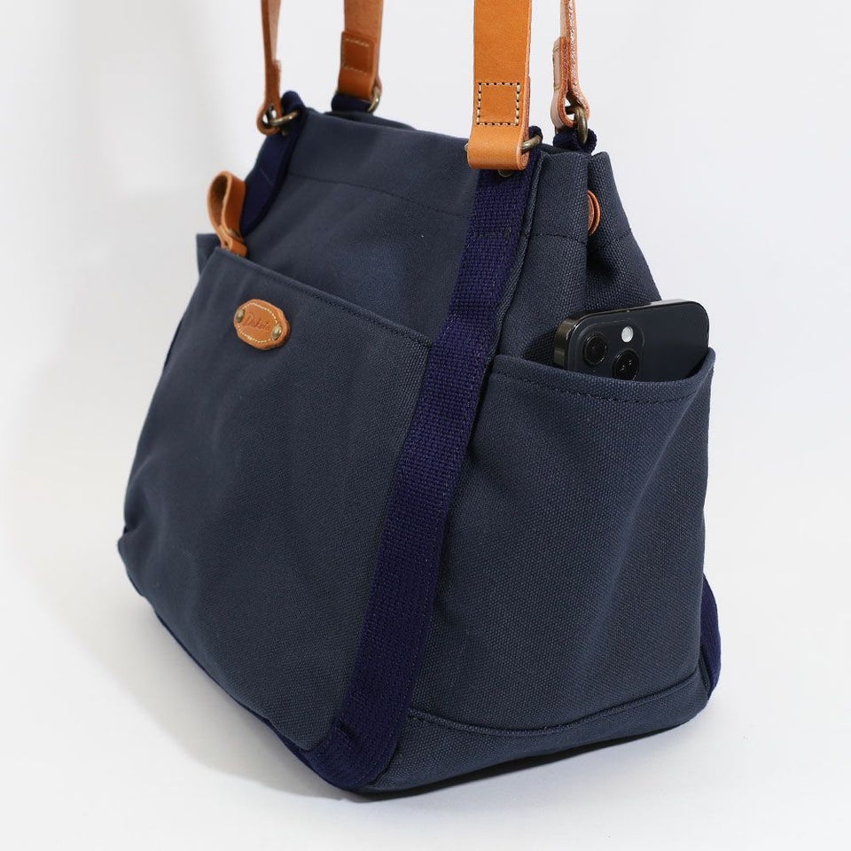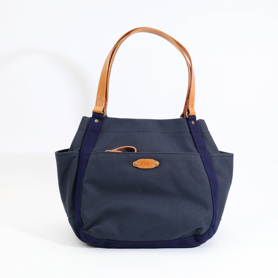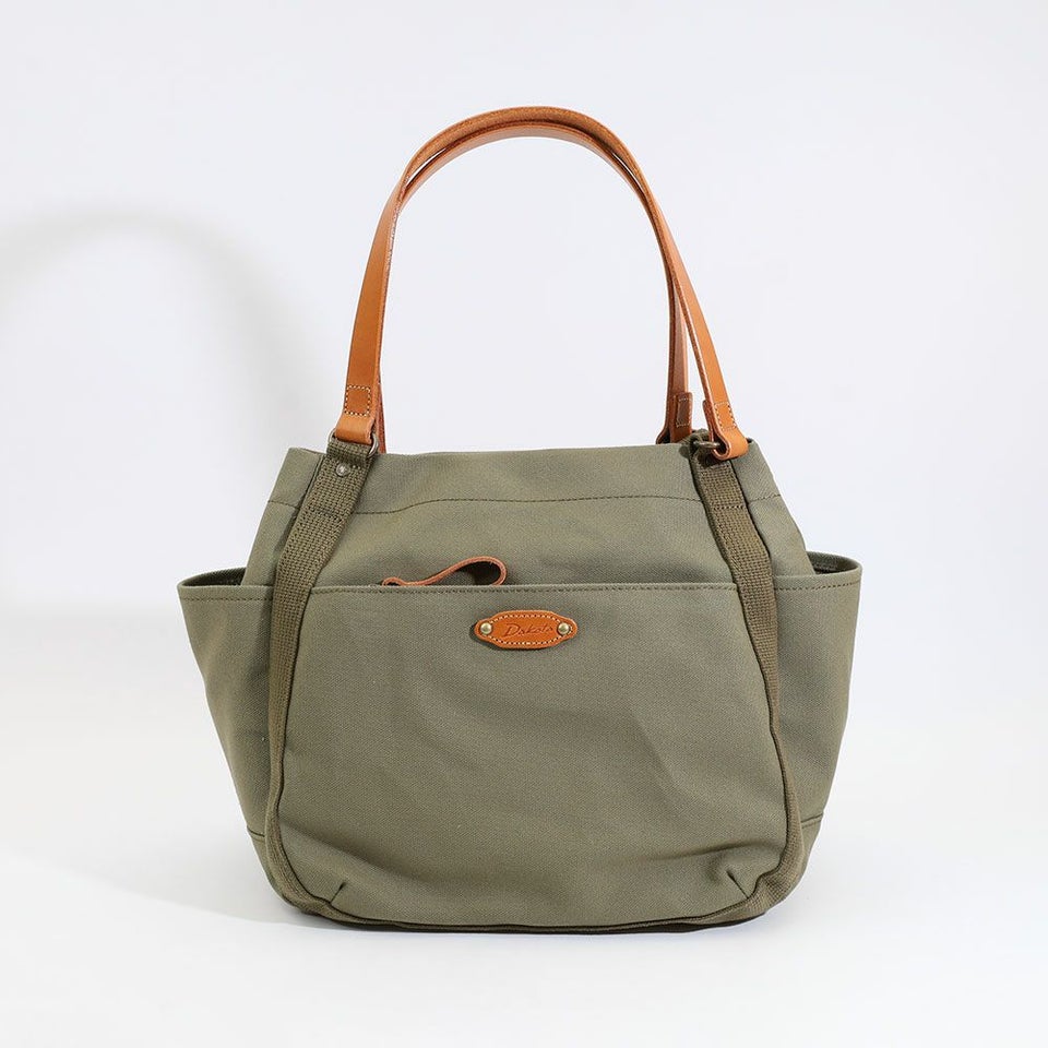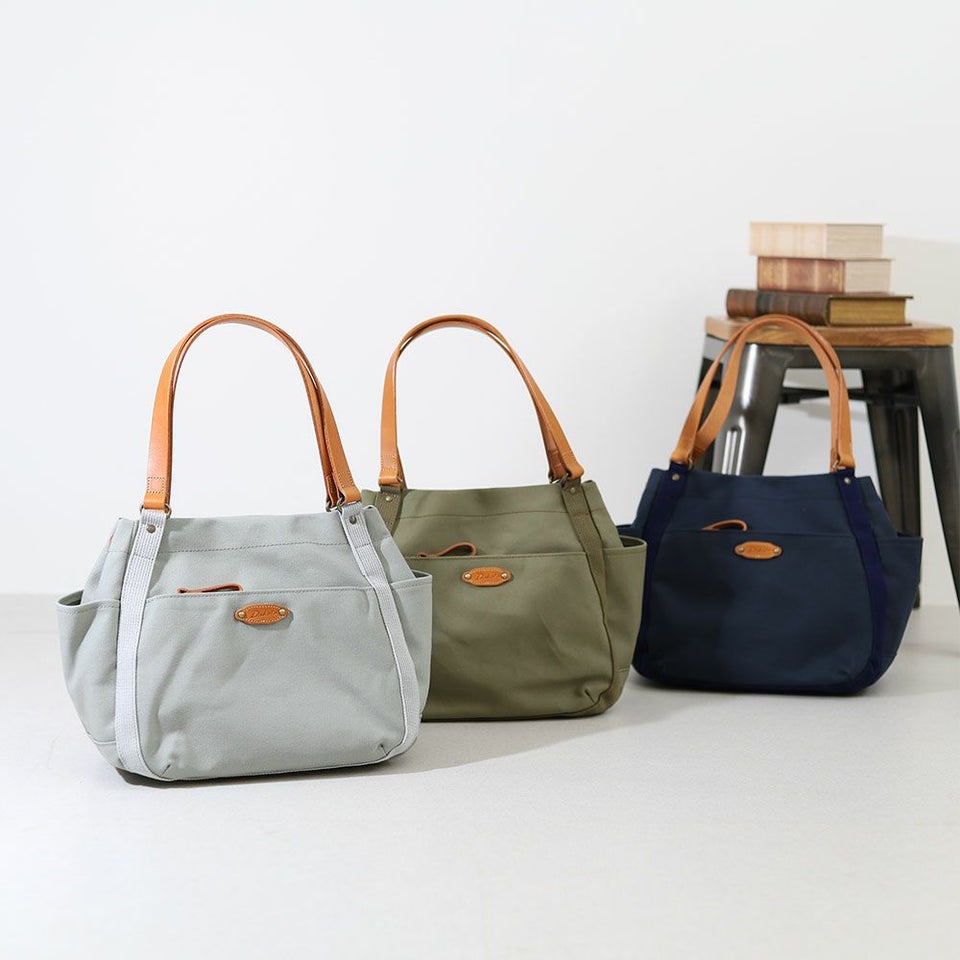 ハリのある帆布に、上質な厚ヌメ革をハンドルやブローチにプラス。素材のコントラストが絶妙で、シンプルながらも上品な存在感を放ちます。季節を問わず、長く使えるのも嬉しいポイント。