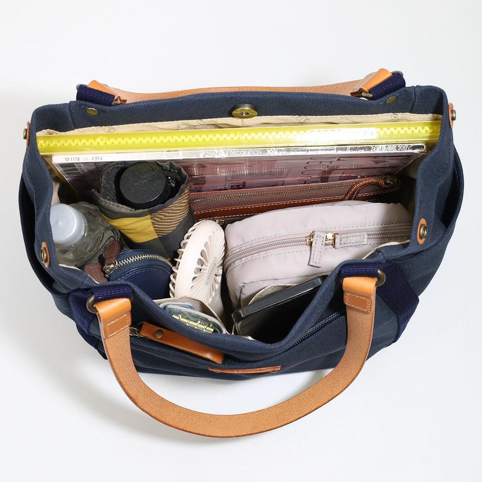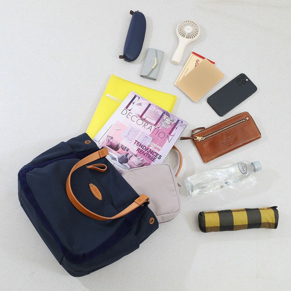 サイドマチを広げればA4サイズもすっぽり収まる実用性。荷物の量やスタイルに合わせてシルエットを変えられる2WAY仕様で、肩掛けもしやすい設計です。通勤やちょっとした外出にも便利です。