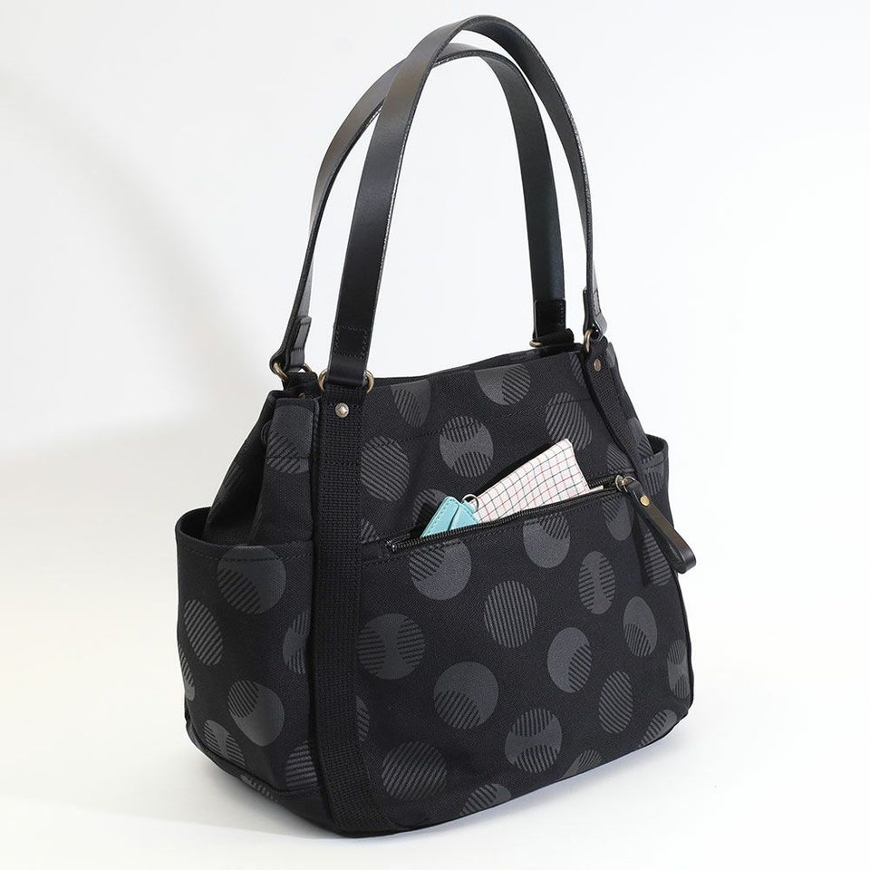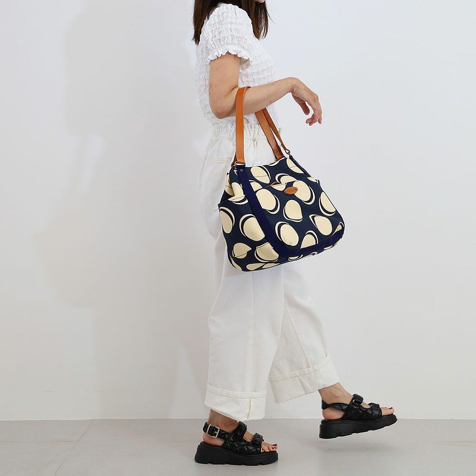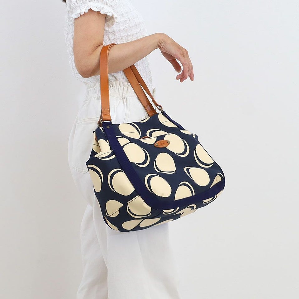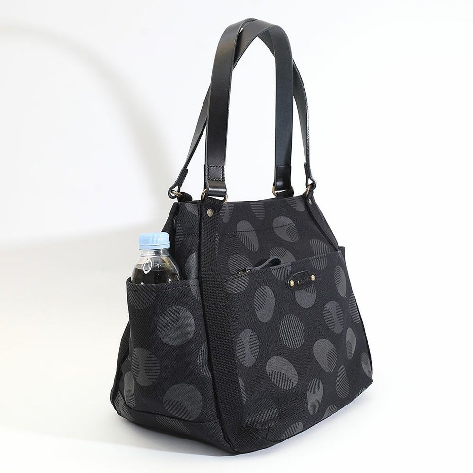 ハリ感のある帆布生地に、動きを感じられる印象的なドット柄をプリントしました。