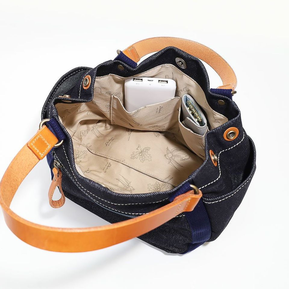本体は軽やかなデニム生地、ハンドルやブローチには厚ヌメ革を使用。飽きの来ないシンプルデザインで、オールシーズン活躍してくれます。