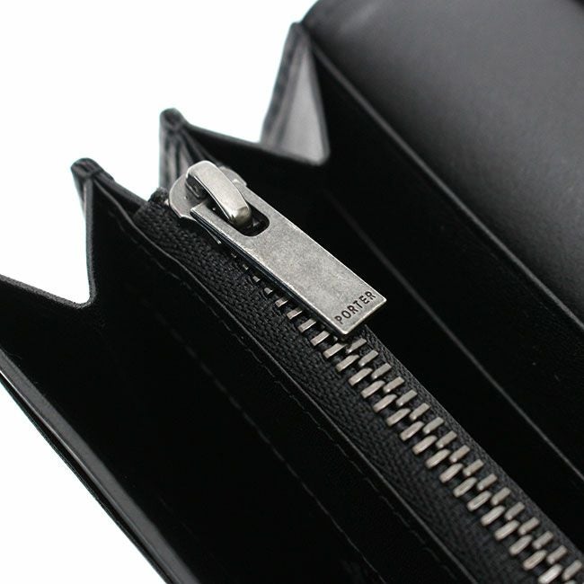 また内装は素材の異なる2種類の革を箇所によって使い分けているので、より贅沢なつくりとなり高級感を高めています。ファスナーは高級感があり手当たりも良いエクセラファスナーを使用しています。表面にはヘリの革の色と合わせたPORTERネームのオリジナル金属プレートを採用し、表革に埋め込むことで見た目をスッキリとさせました。