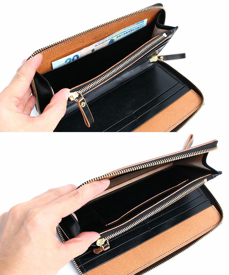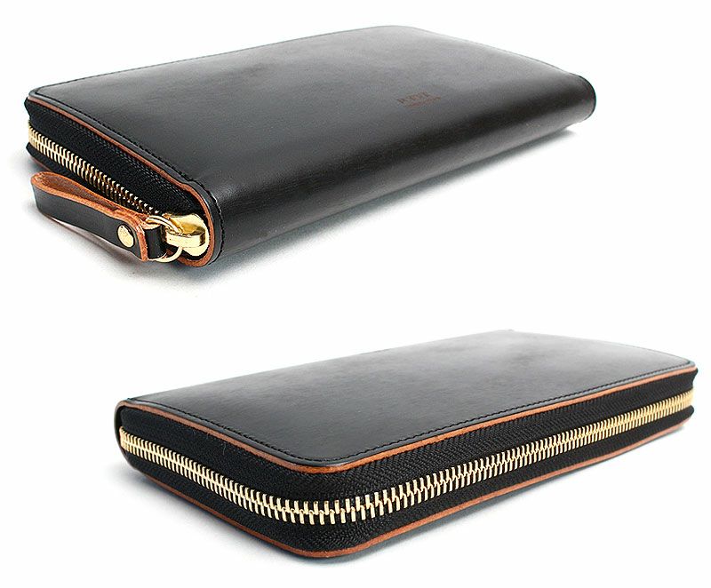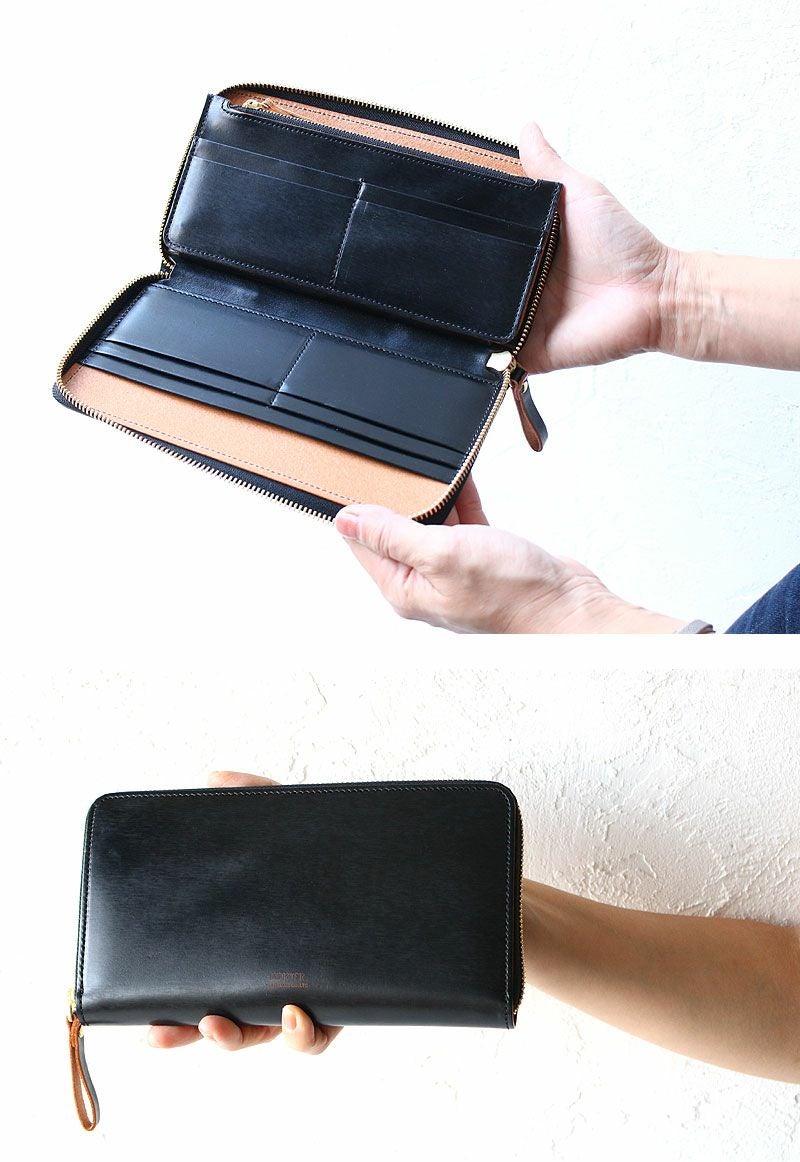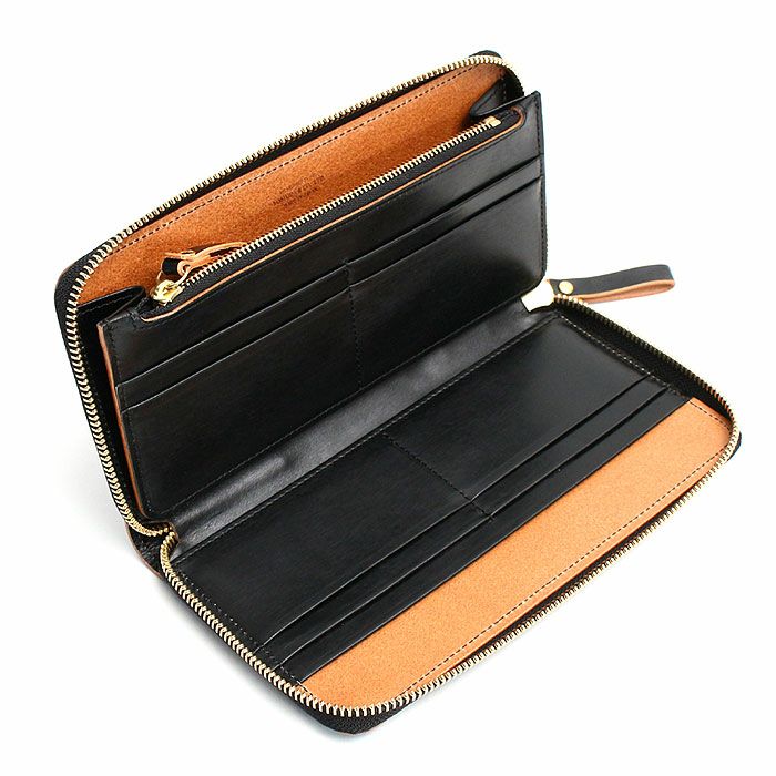 目の詰まったコシのある風合いが特徴の革は、植物タンニンのみを使った鞣し方法を長年守り続けている、イタリア・トスカーナ地方のタンナーでじっくりと丹念に鞣されたヌメ革を使用しています。ショルダー革にはトラと呼ばれる背骨に沿った特徴的な凹凸があり、ガラス加工をした後にヤスリで削る際、その凹凸によって擦れ方に差異が出るため仕上がりが不均一となり、1枚1枚表情が異なるのが魅力です。また、オイルをしっかりと含んでいるため、使うほどに徐々に柔らかく手になじんだ風合いになってきます。高級感があり、滑らかな開閉と光沢が特徴のゴールドメッキのエクセラファスナーを使用し、コインケースなどの小さなアイテムにもあえて太番手のファスナーを使用することでシリーズのデザインポイントにしています。表面のガラス加工のブラックとヌメ革のコントラストを楽しめるように、外装は切り目磨きでコバ部分を丁寧に磨いてからトップコートで仕上げており、内装も裏地を使わずに革のみで贅沢に仕立てています。